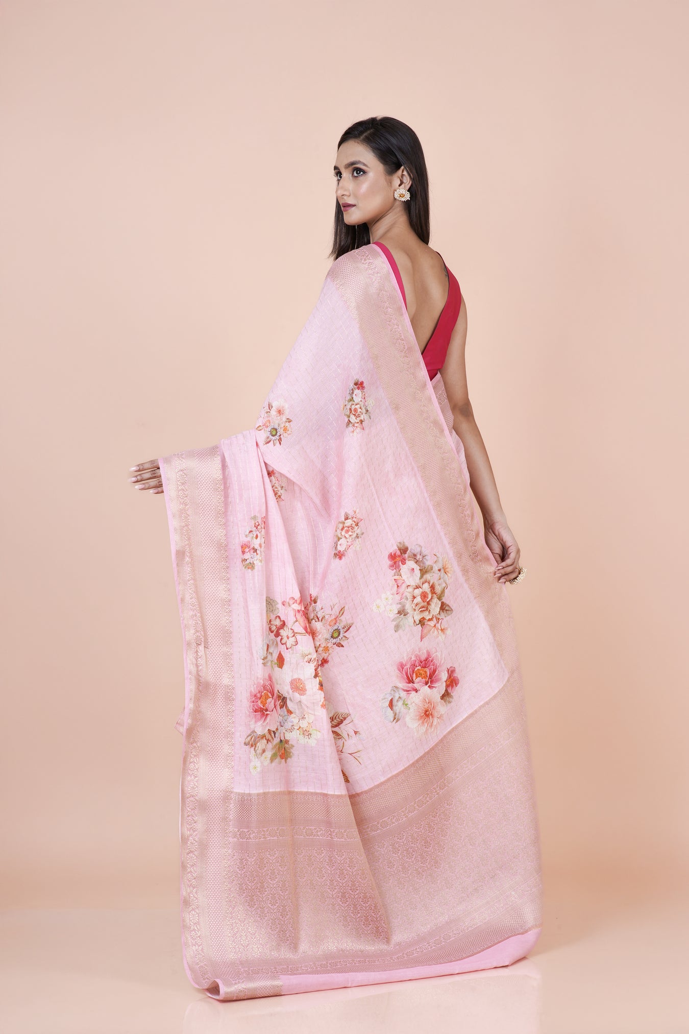 Premium pink Chanderi check saree by Indiloom with digital floral print, blending classic checks with modern style.