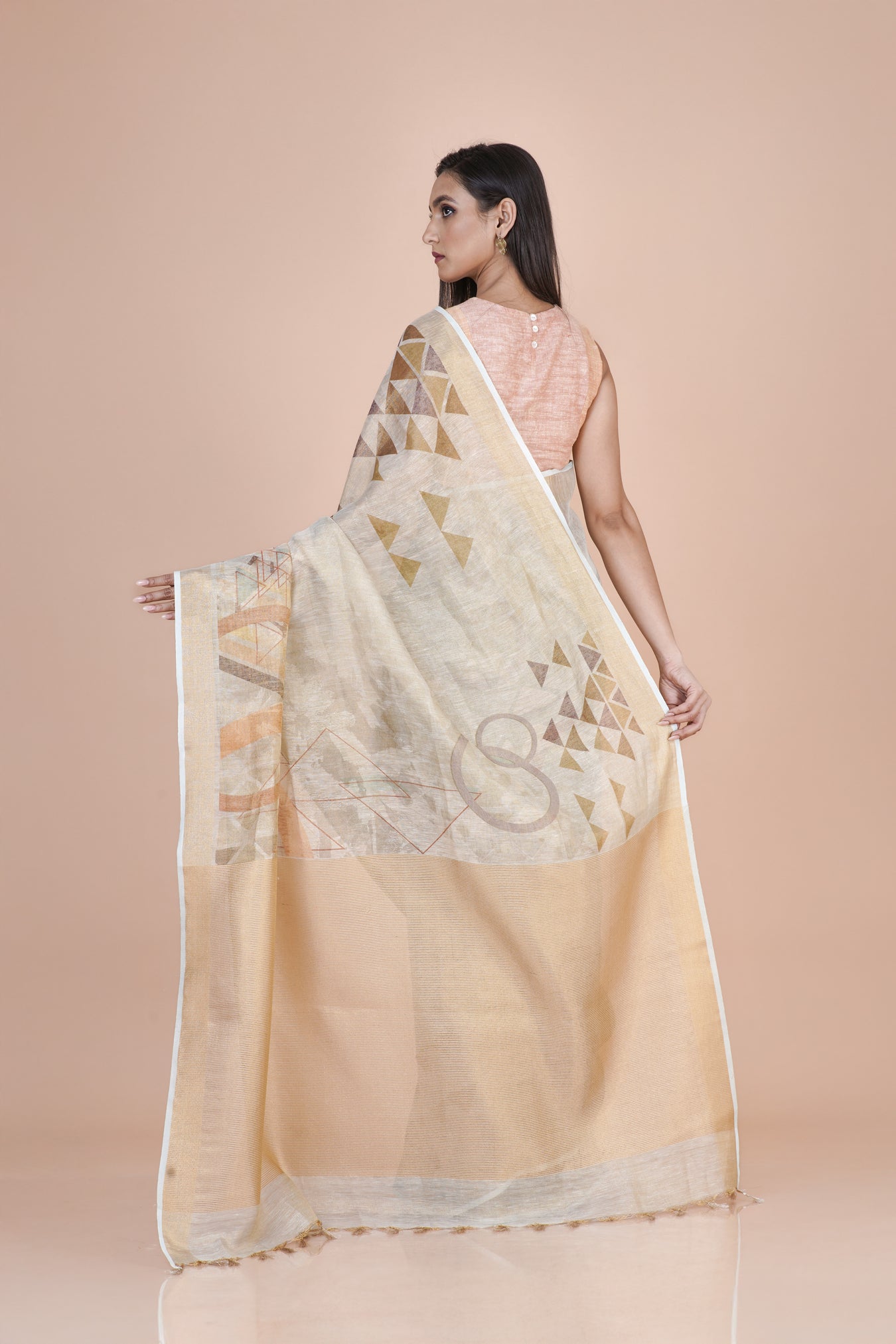 Indiloom presents a beige linen tissue saree with digital geometric print, featuring a lightweight texture and modern elegance.