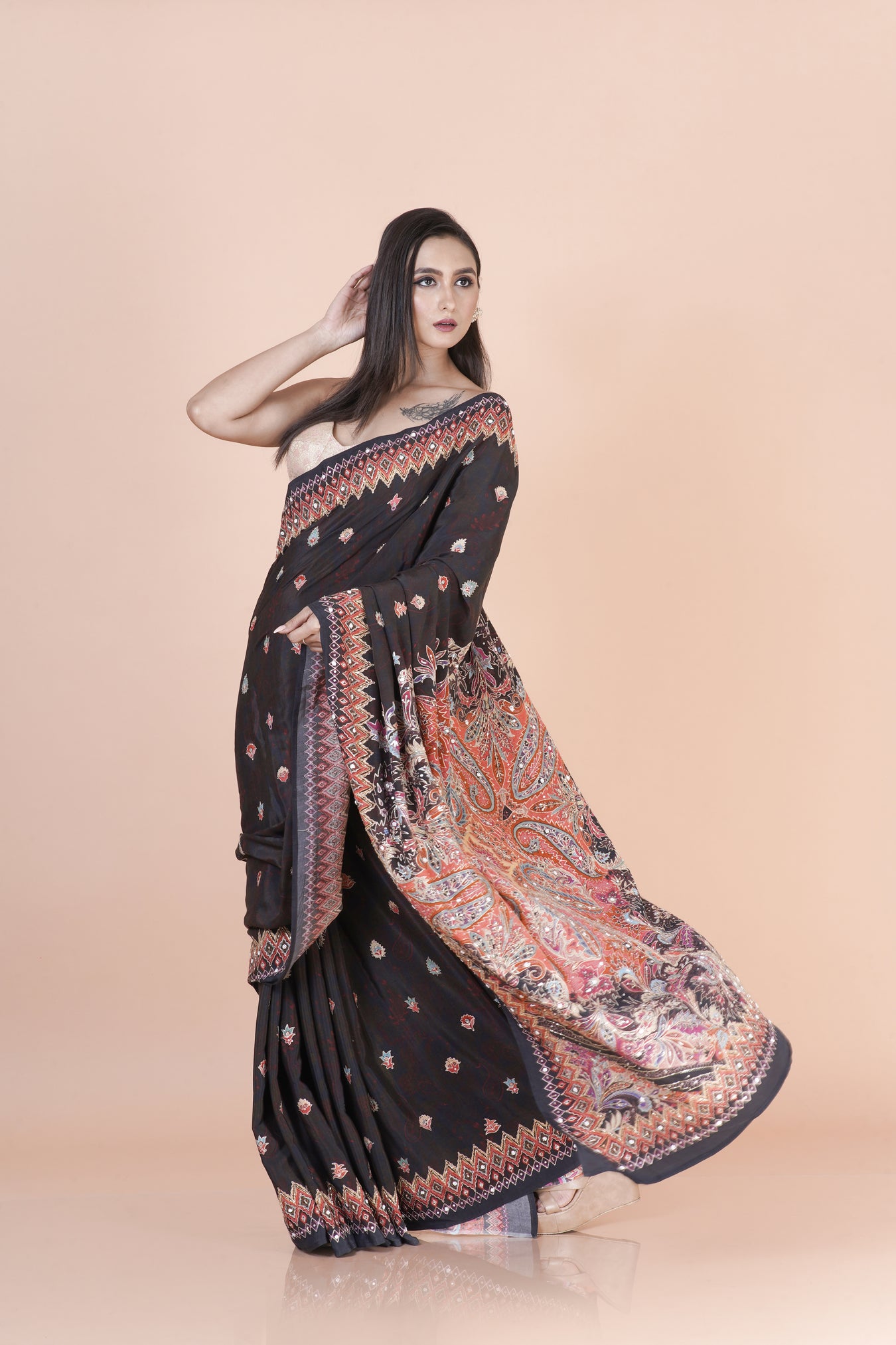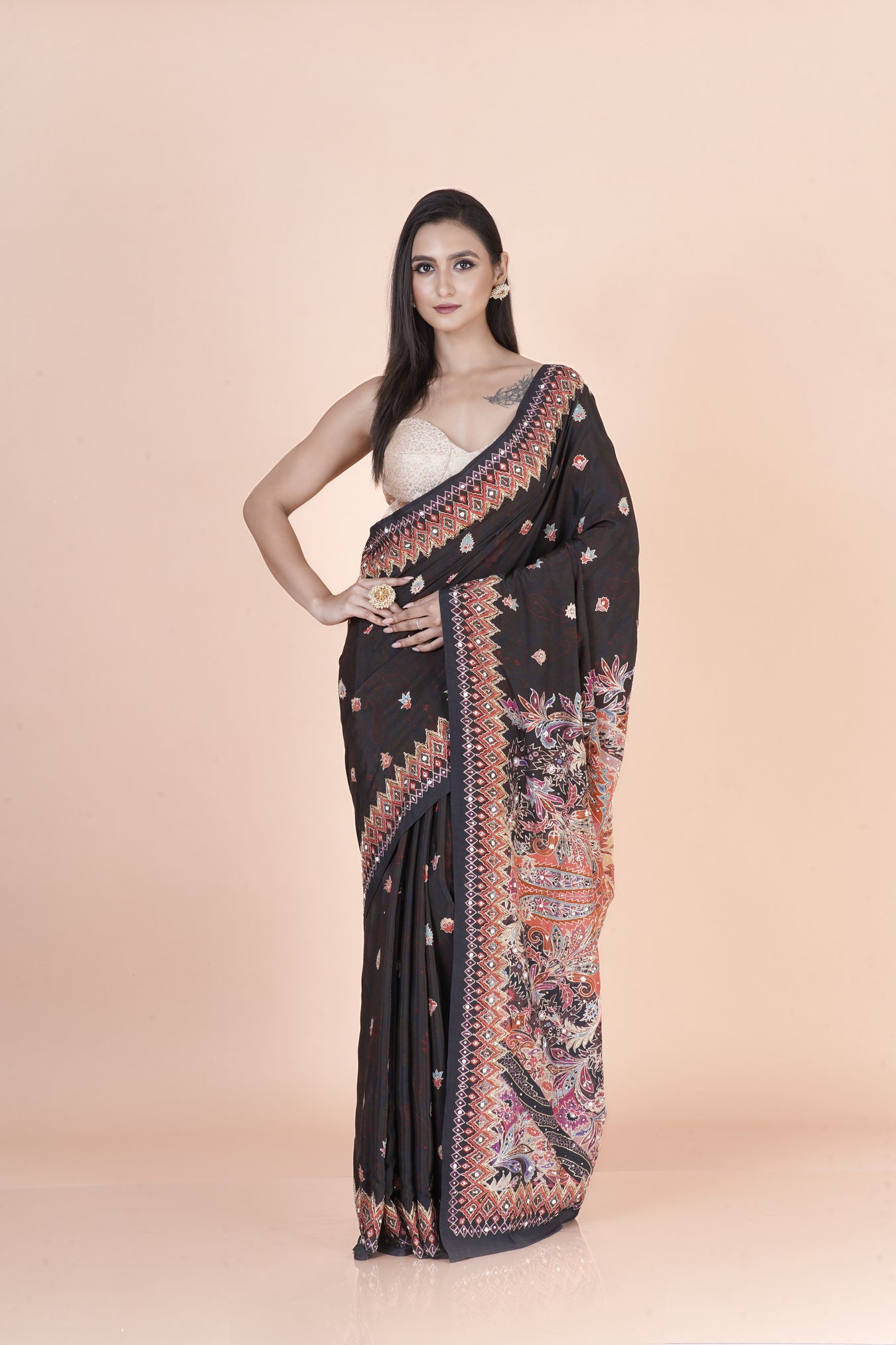 Digitally printed black crepe saree featuring intricate hand zardosi bead detailing with floral-geometric motifs.