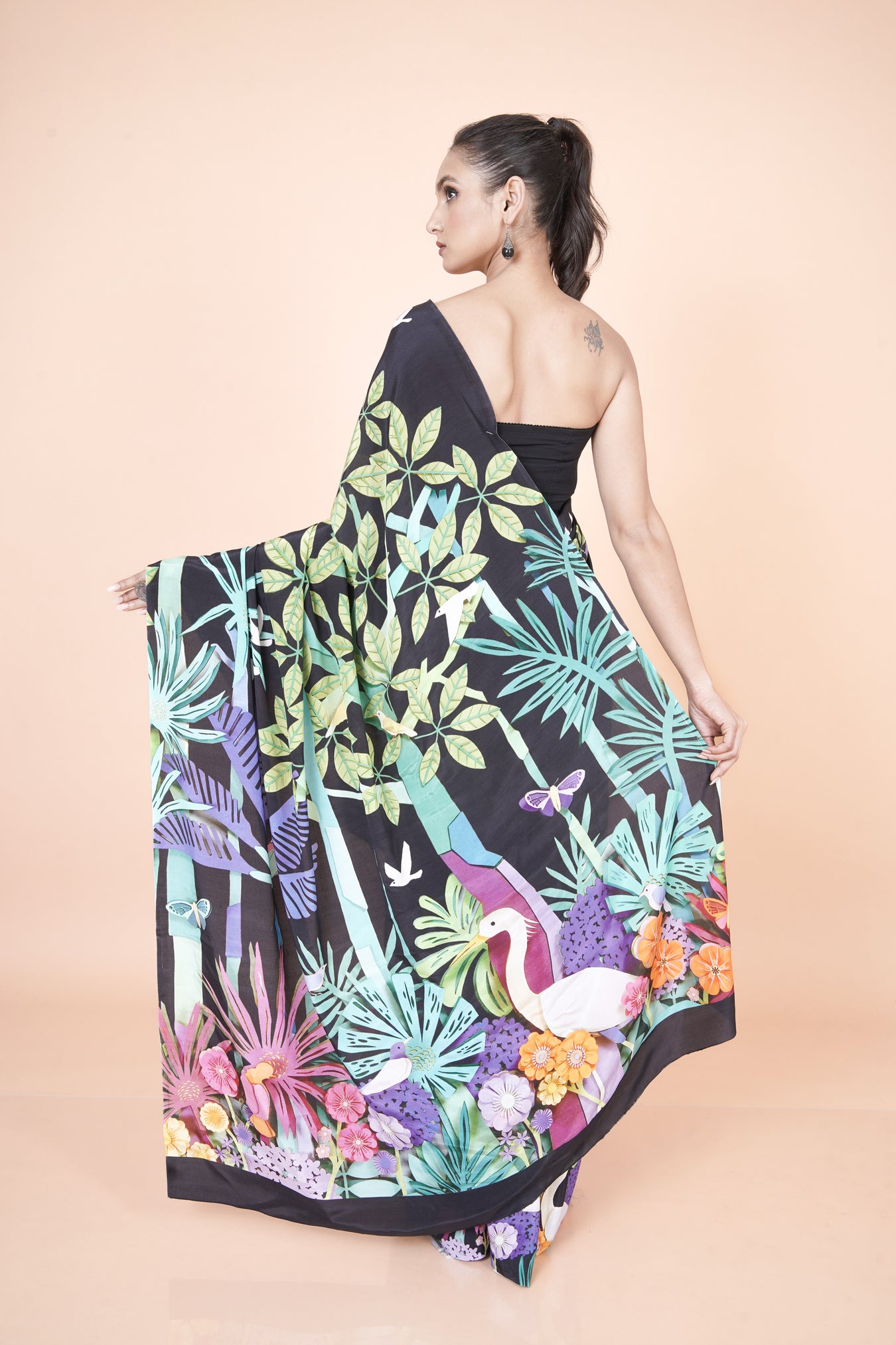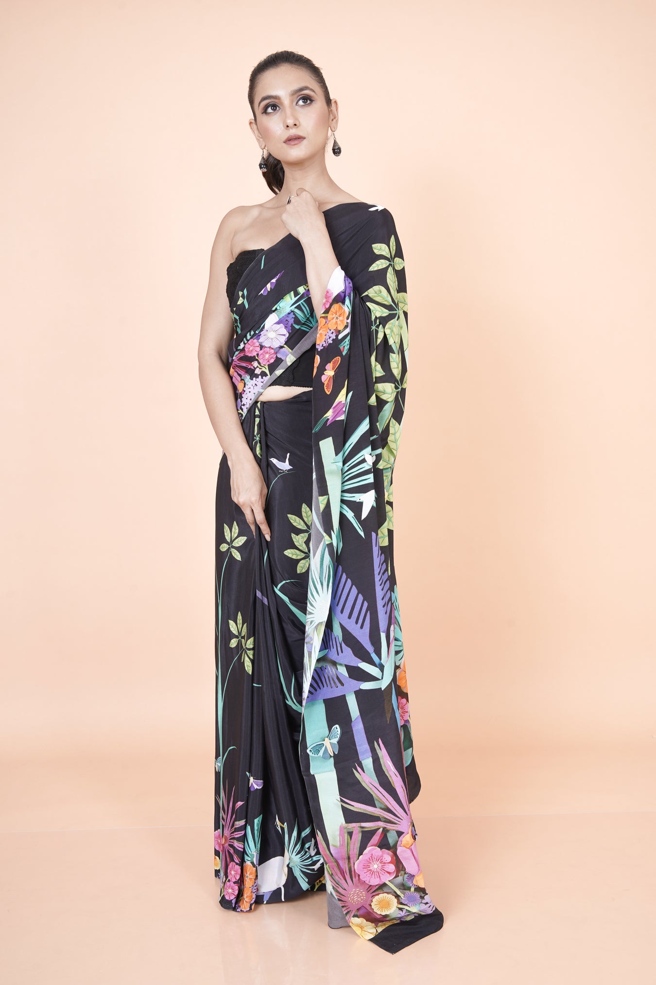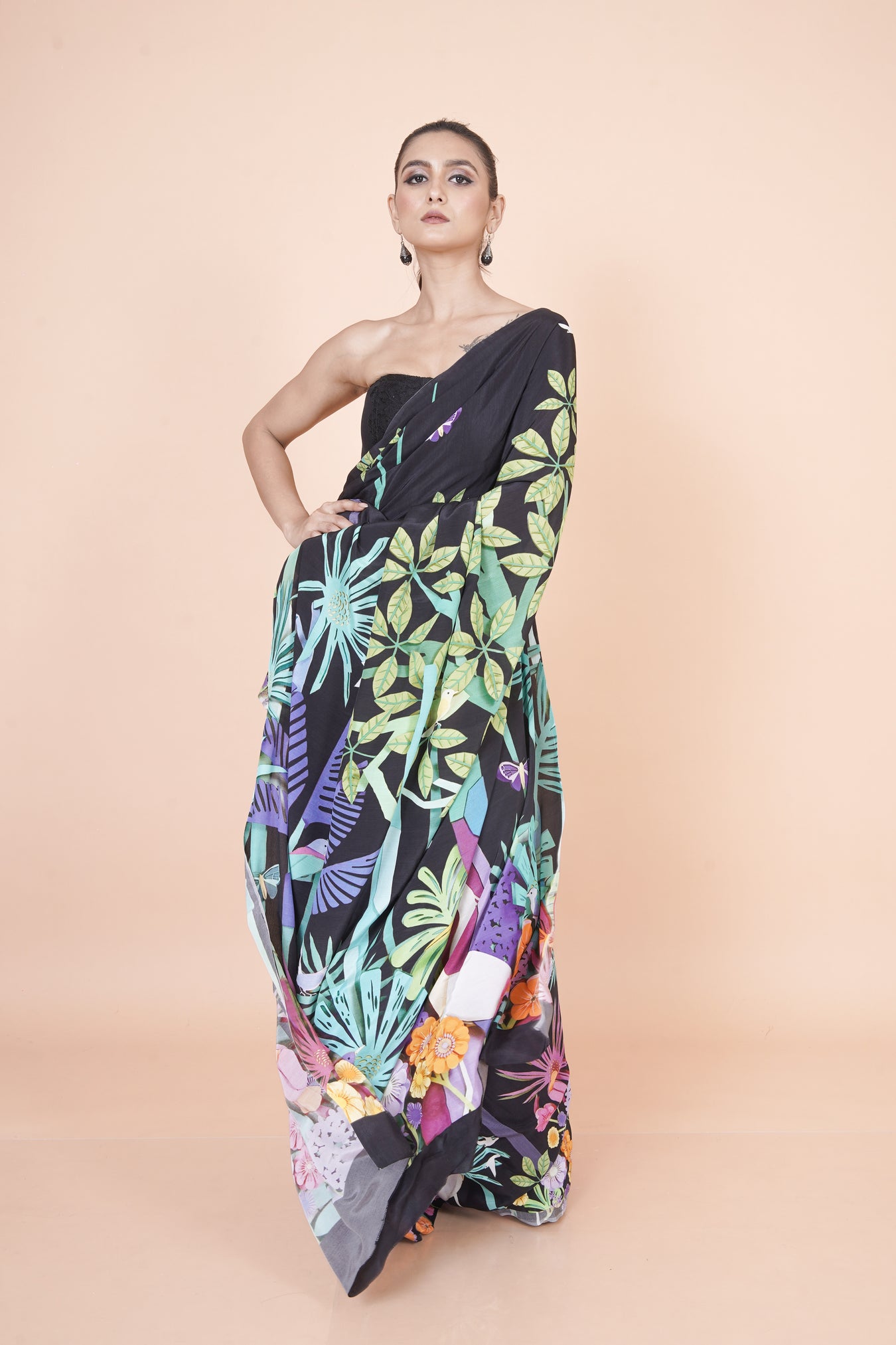 Lightweight multicolor crepe saree showcasing botanical digital prints with effortless elegance.