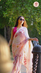 Pattern and print: Embrace the ethereal charm of our chinon saree with exquisite embellishments, where delicate blooms meet artful adornments, creating a captivating and enchanting ensemble that celebrates the beauty of nature and style.