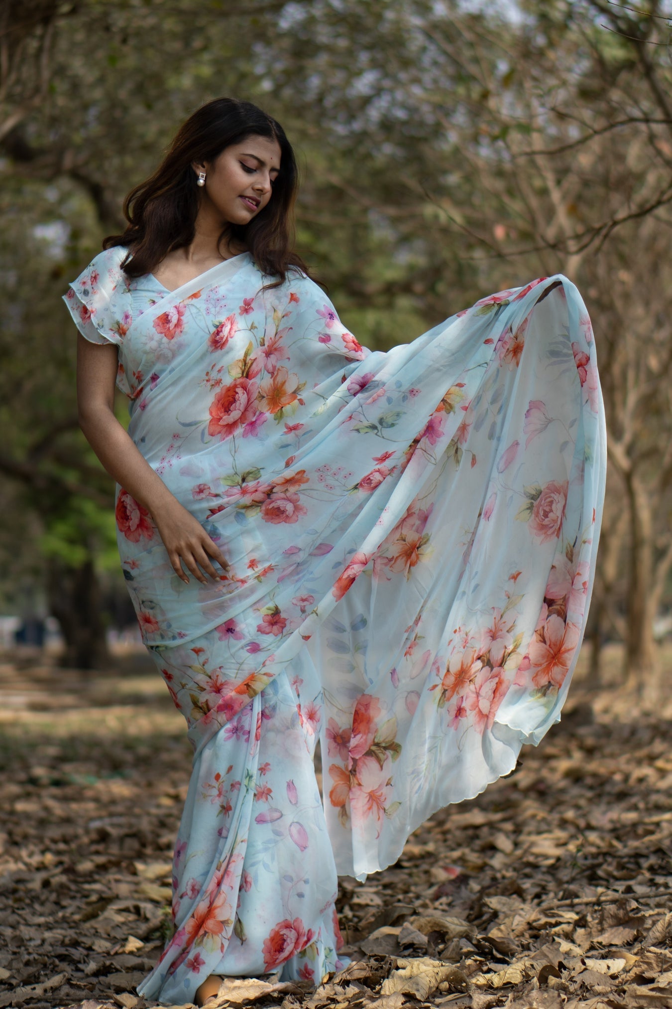 Pattern and print: The Sky blue georgette saree adorned with a captivating design featuring red and pink flower branches throughout the fabric. Georgette is a lightweight and sheer fabric known for its flowing and draping characteristics. It adds an ethereal and graceful quality to the saree, making it a popular choice for traditional wear.