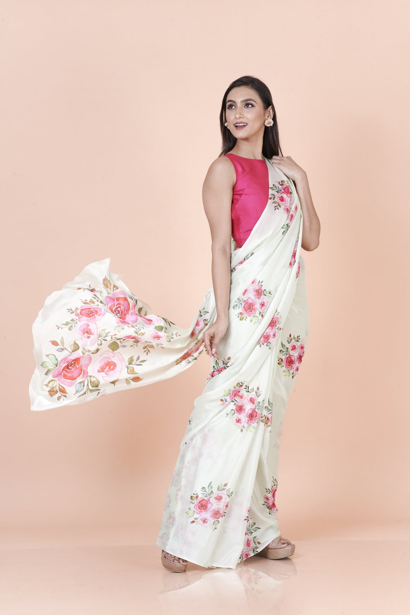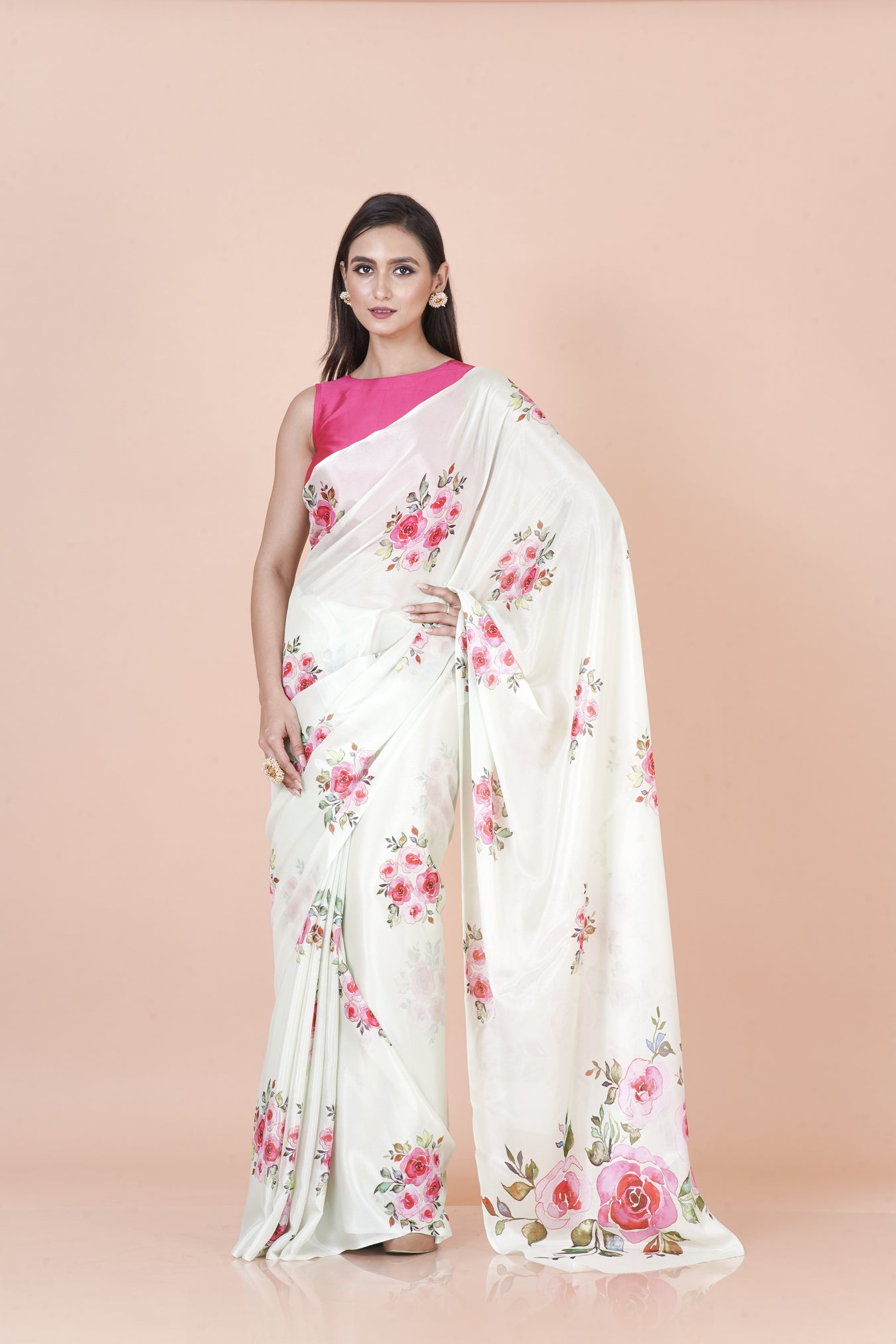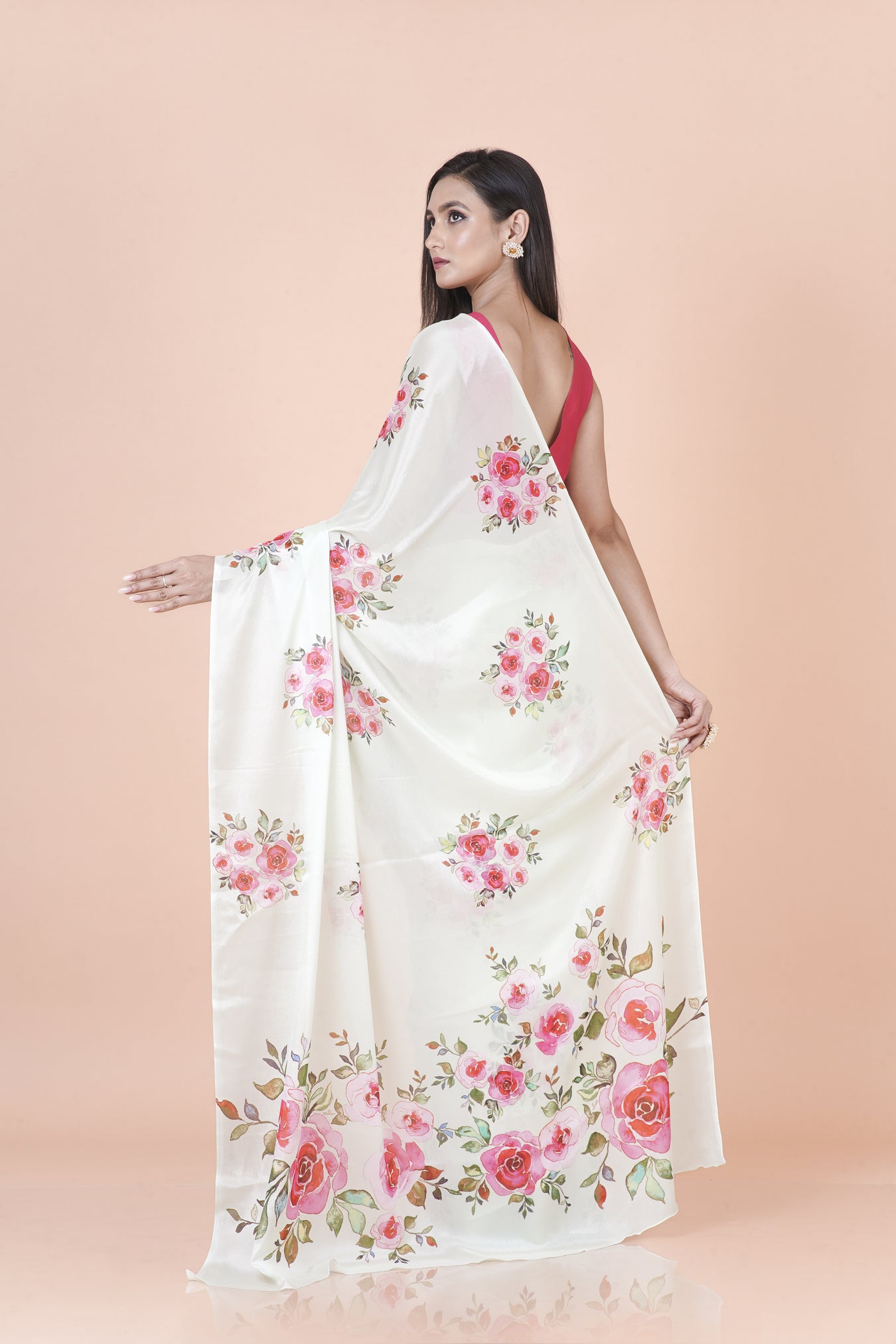 A classic white chinon silk saree showcasing floral digital prints with effortless elegance.