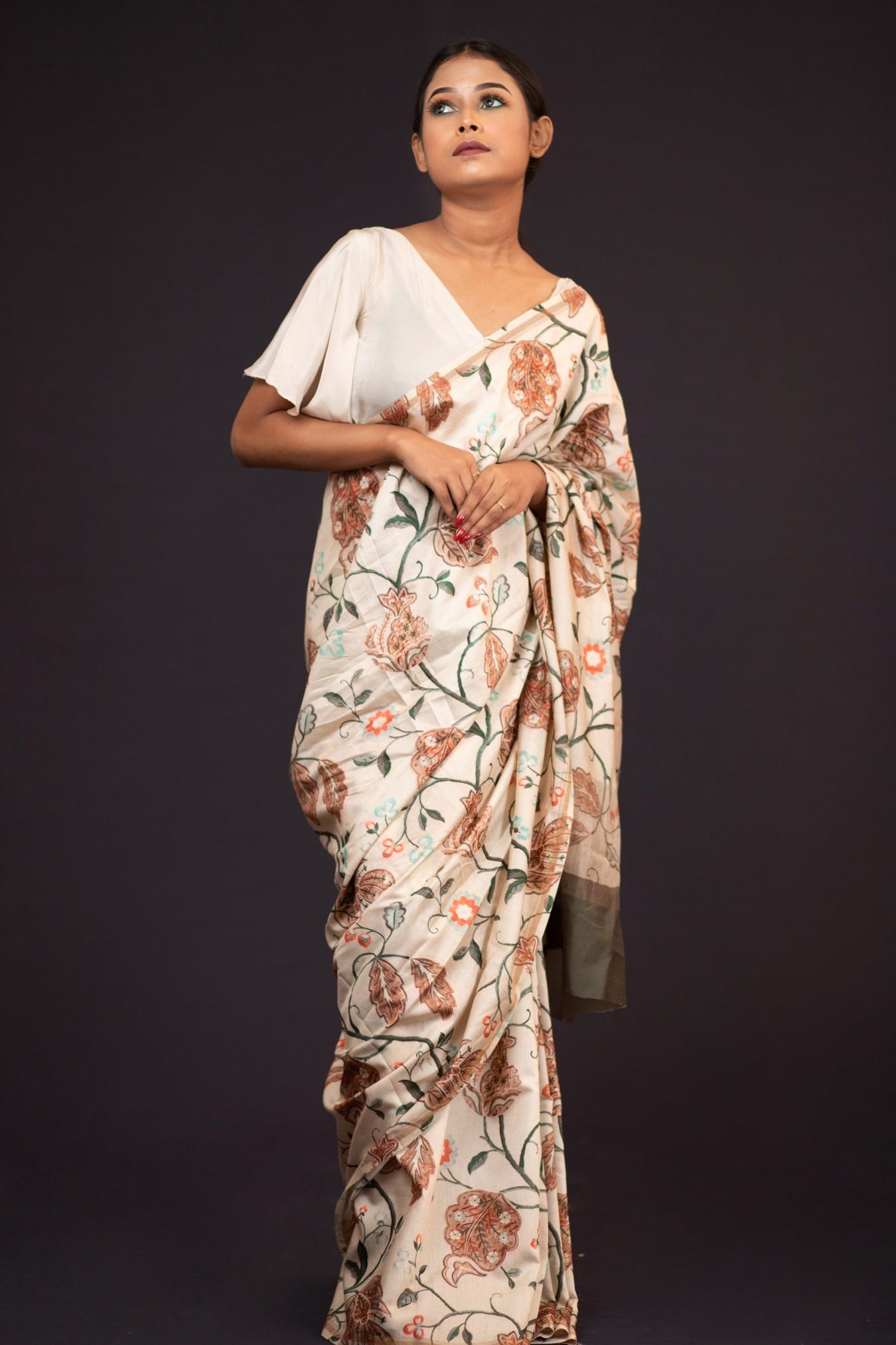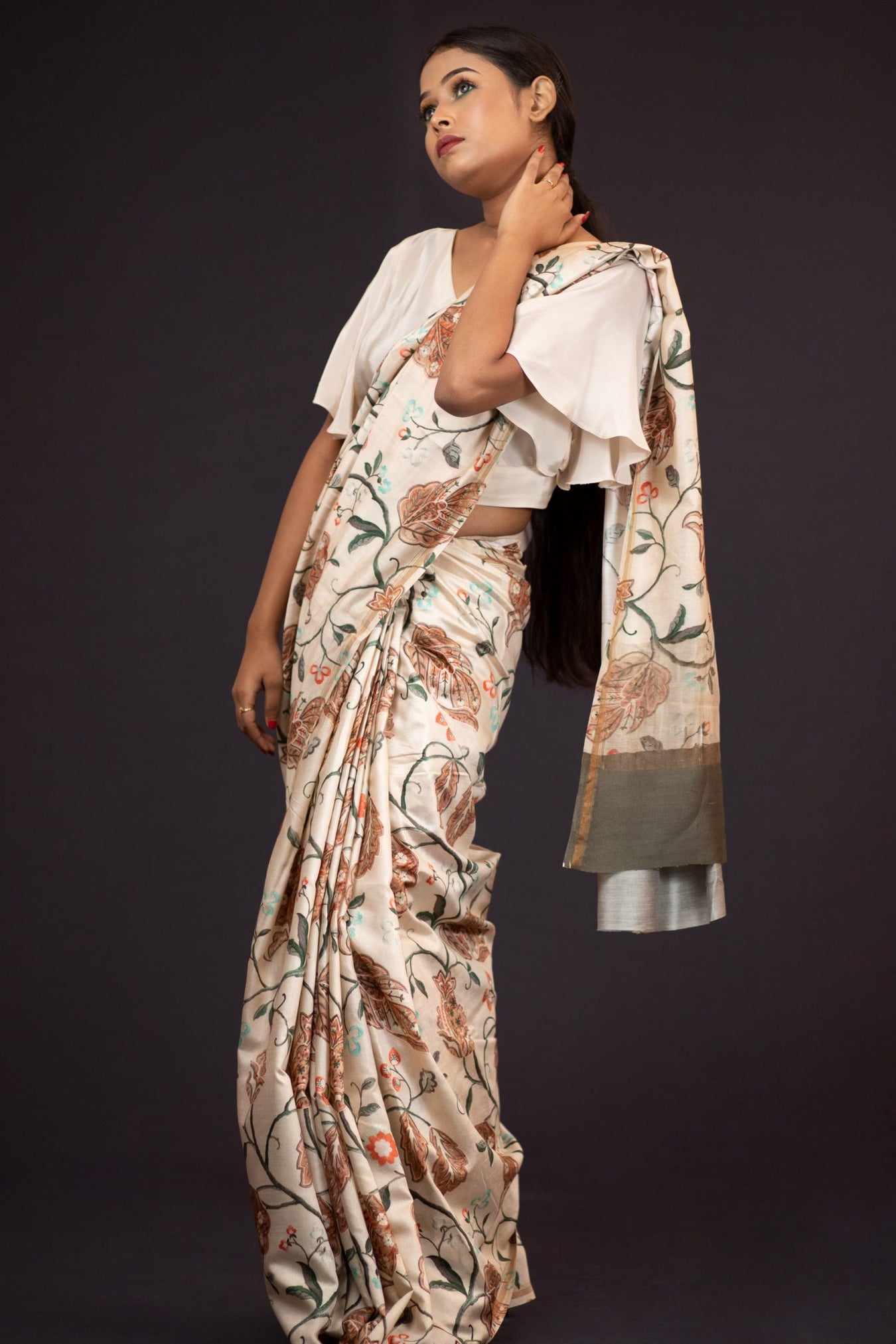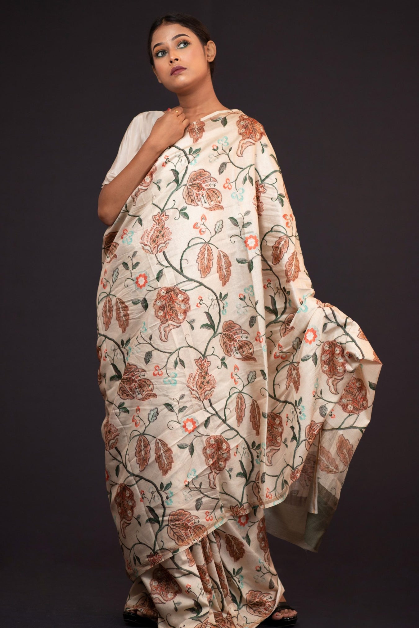 Fabric: Chanderi Zari Woven saree Color: Light Beige Pattern and Print: Groundnut color creeper over oyster cream colored saree with small zari strip border. The subtle color of the creeper over the cream solid base, makes a unique composition highlighting the soft colors of this piece. The saree makes a statement with it's soft drapes, earthy tones, and sophisticated look, embracing natural beauty.Silk Purity: Pure ChanderiPack Contains: 1 Saree, 1 BlouseCare Instructions: Dry wash                  Â