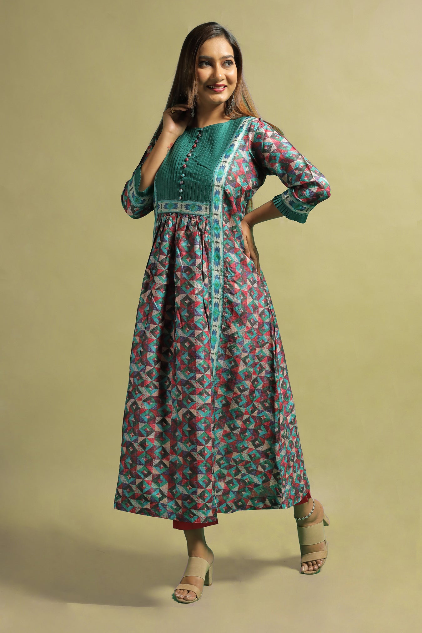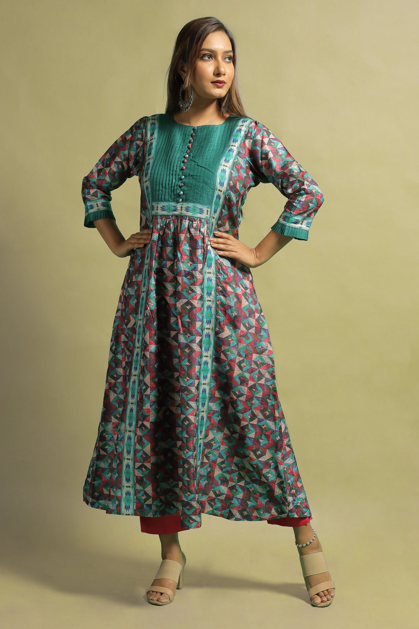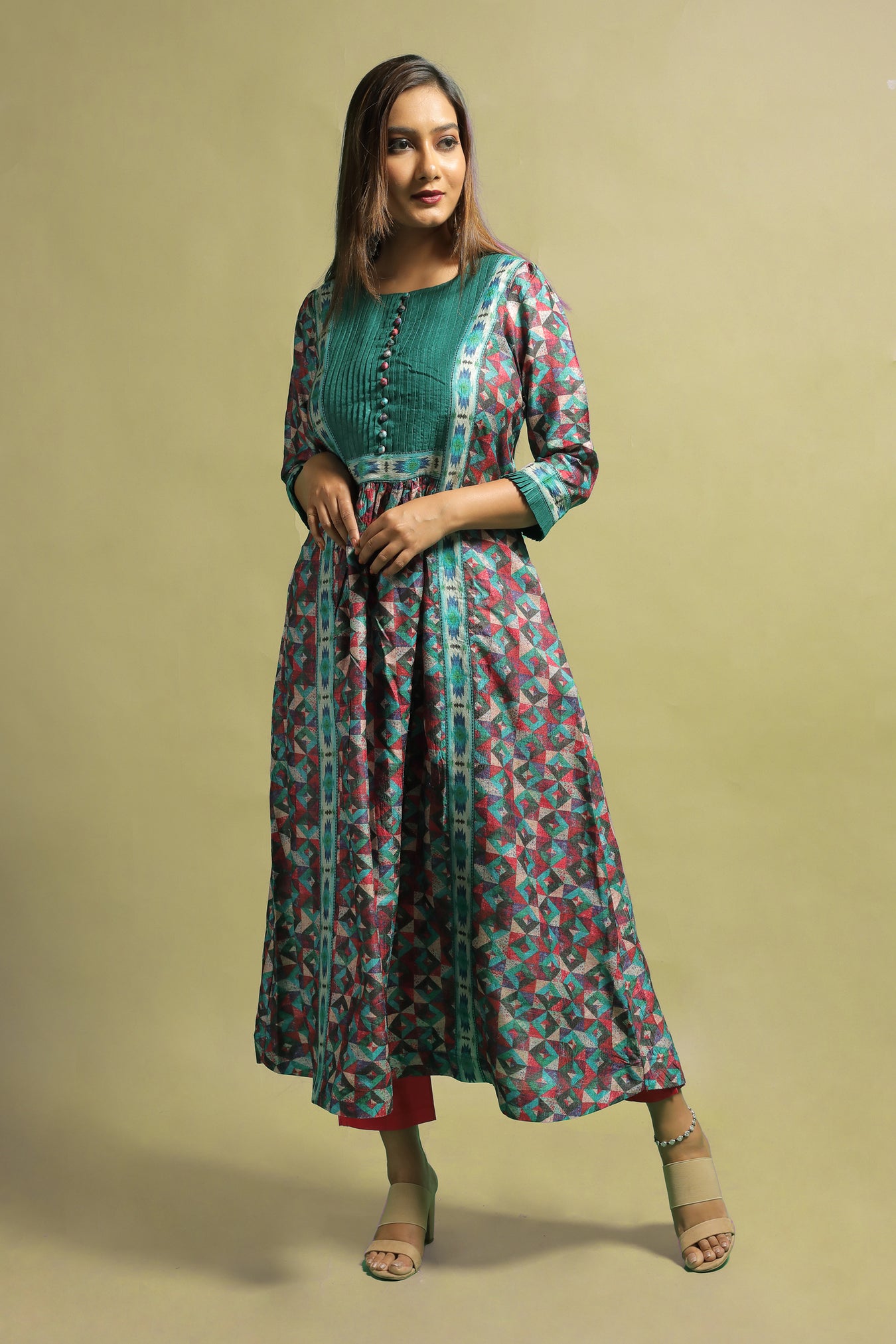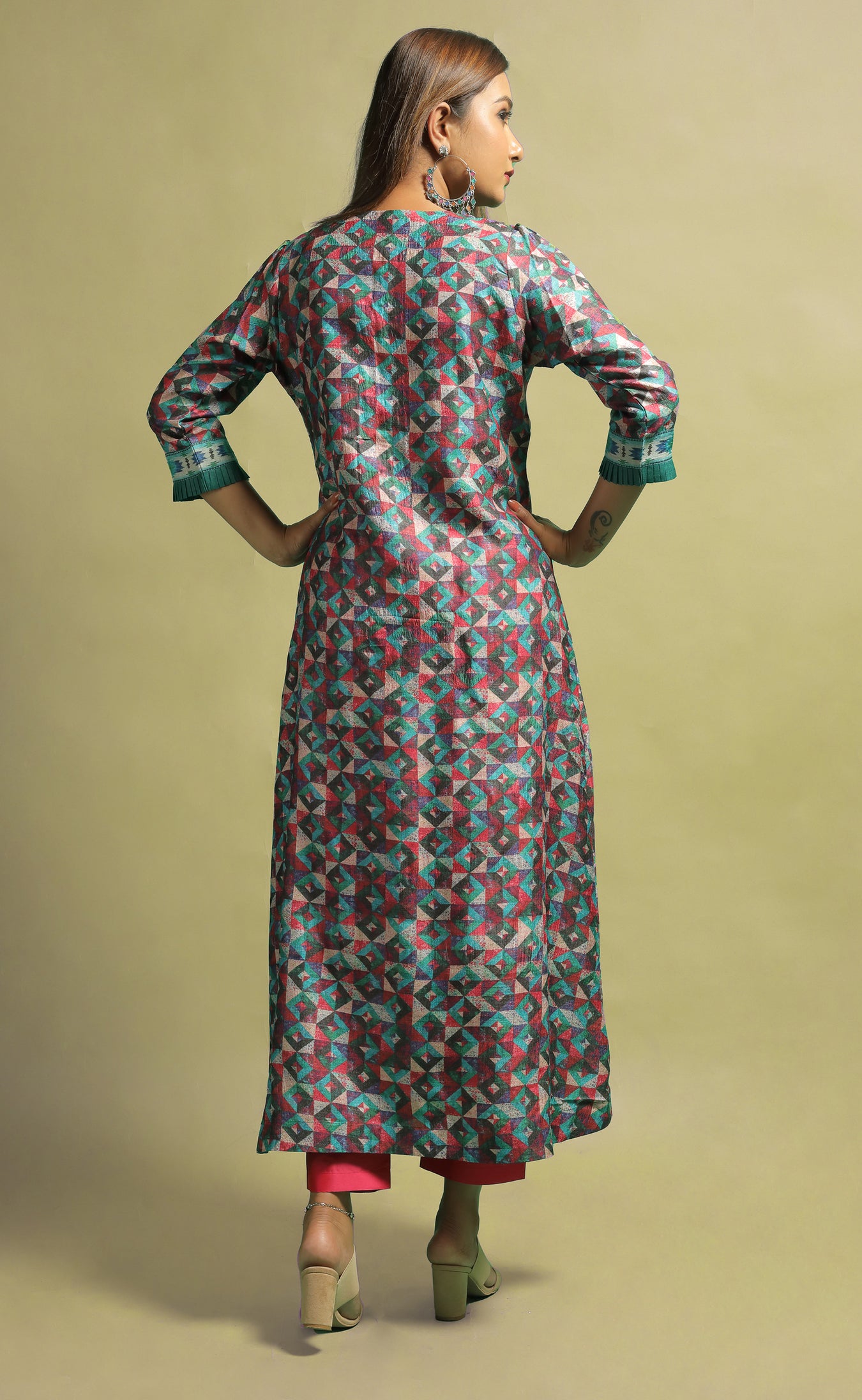 Tussar Ghicha fabric was transformed into a chic ethnic kurti. The piece makes a statement while also adding a touch of elegance and authenticity with its block-like Geometric motifs printed in a variety of pastel tones. This piece is one-of-a-kind due to the subtle toned motifs with a shine. Pin tucks with colourful buttons adorn the front, making the entire look stand out. Its style is enhanced by wide stripes of ikat motif design. Own and style this piece to highlight your inner beauty and elegance, as well as to confidently and proudly flaunt the traditional look.