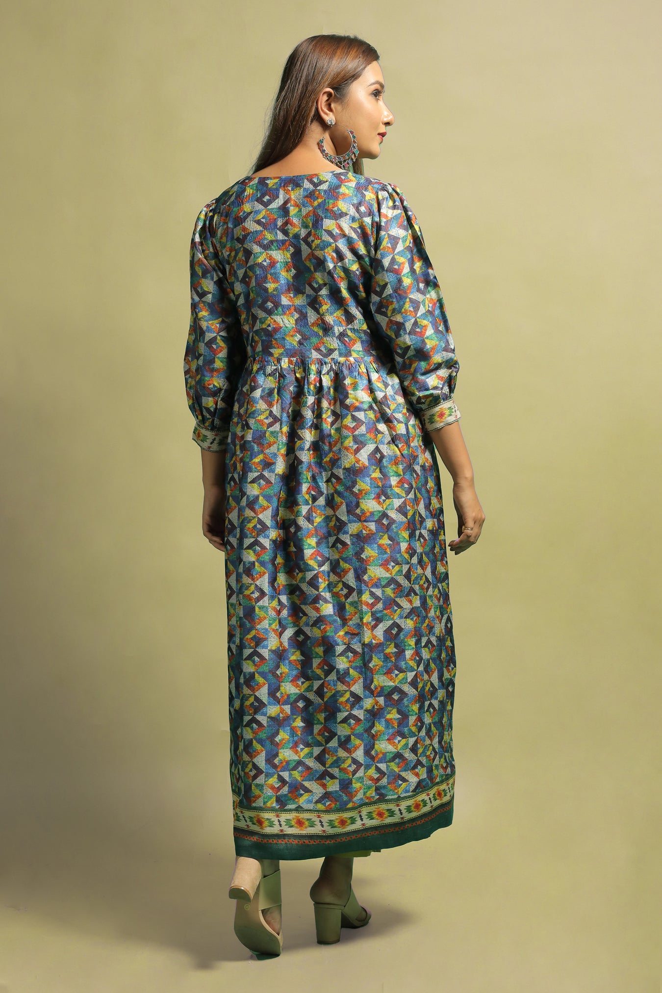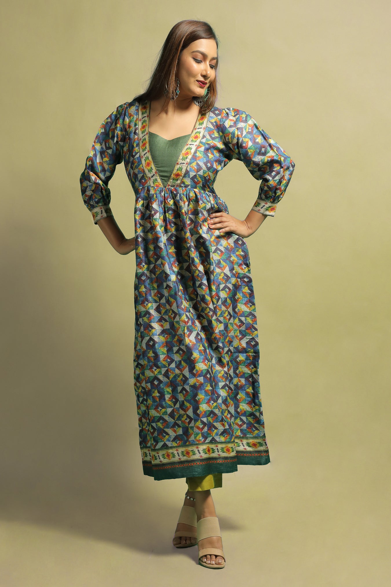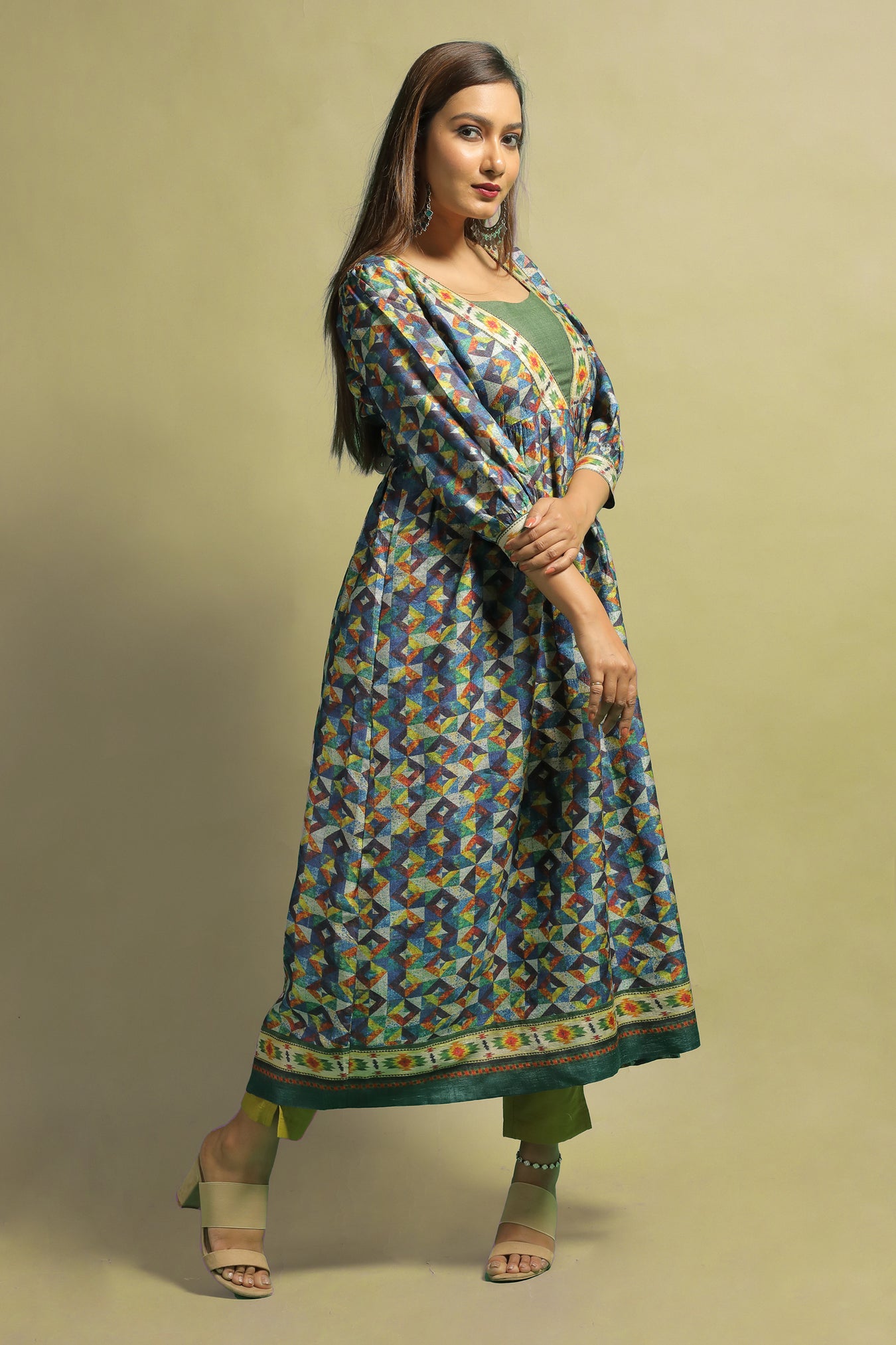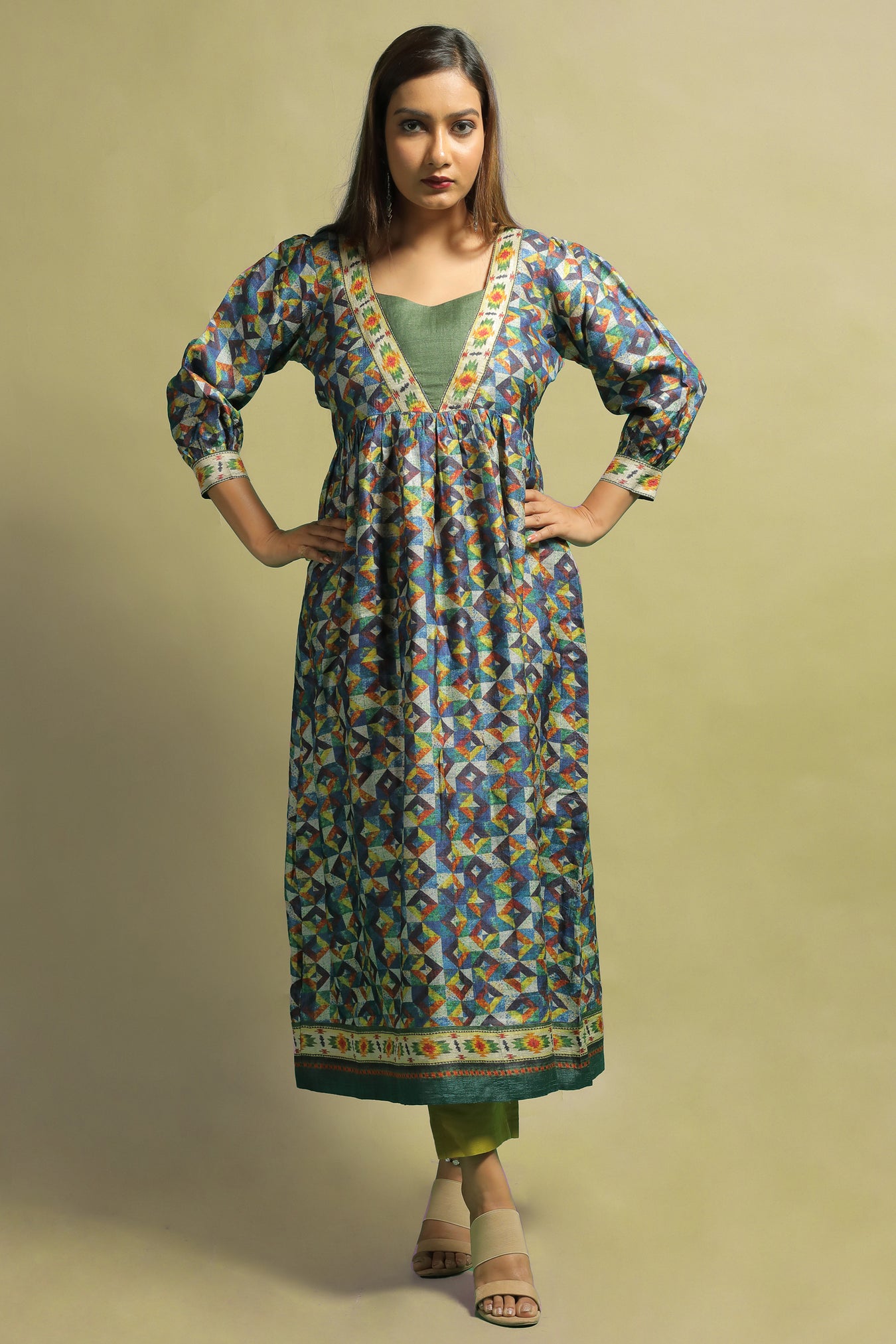 A classy ethnic kurti made from Tussar Ghicha cloth. The garment makes a statement while also bringing a sense of refinement and genuineness with its block like Geometric designs printed in numerous pastel tones. This necklace is one-of-a-kind because of the subtle toned designs with a sheen. The kurti's design is enhanced by a V-shaped neckline. The piece's modern style is enhanced by the cuffed long sleeves. The neckline and edges of the item are embellished with ikat design stripes. Own and dress this piece to bring out your inner beauty and elegance, as well as to proudly wear the traditional appearance.
