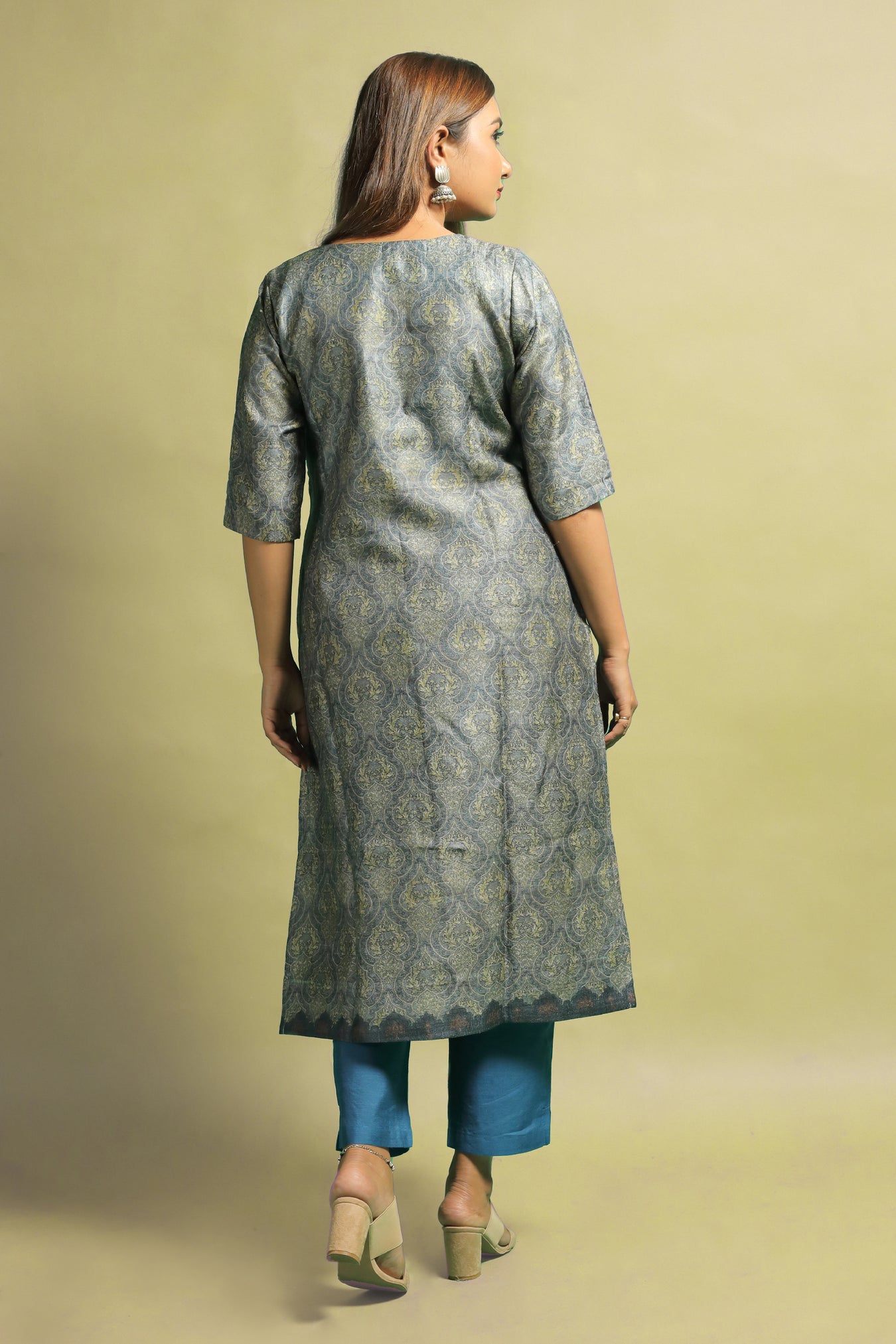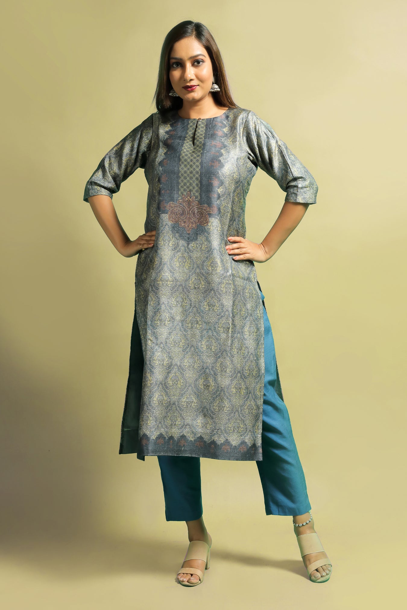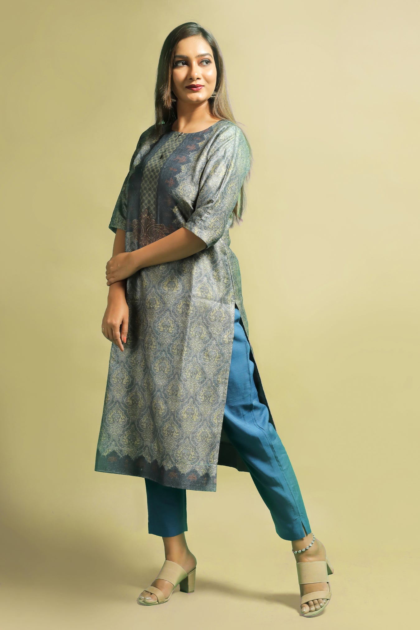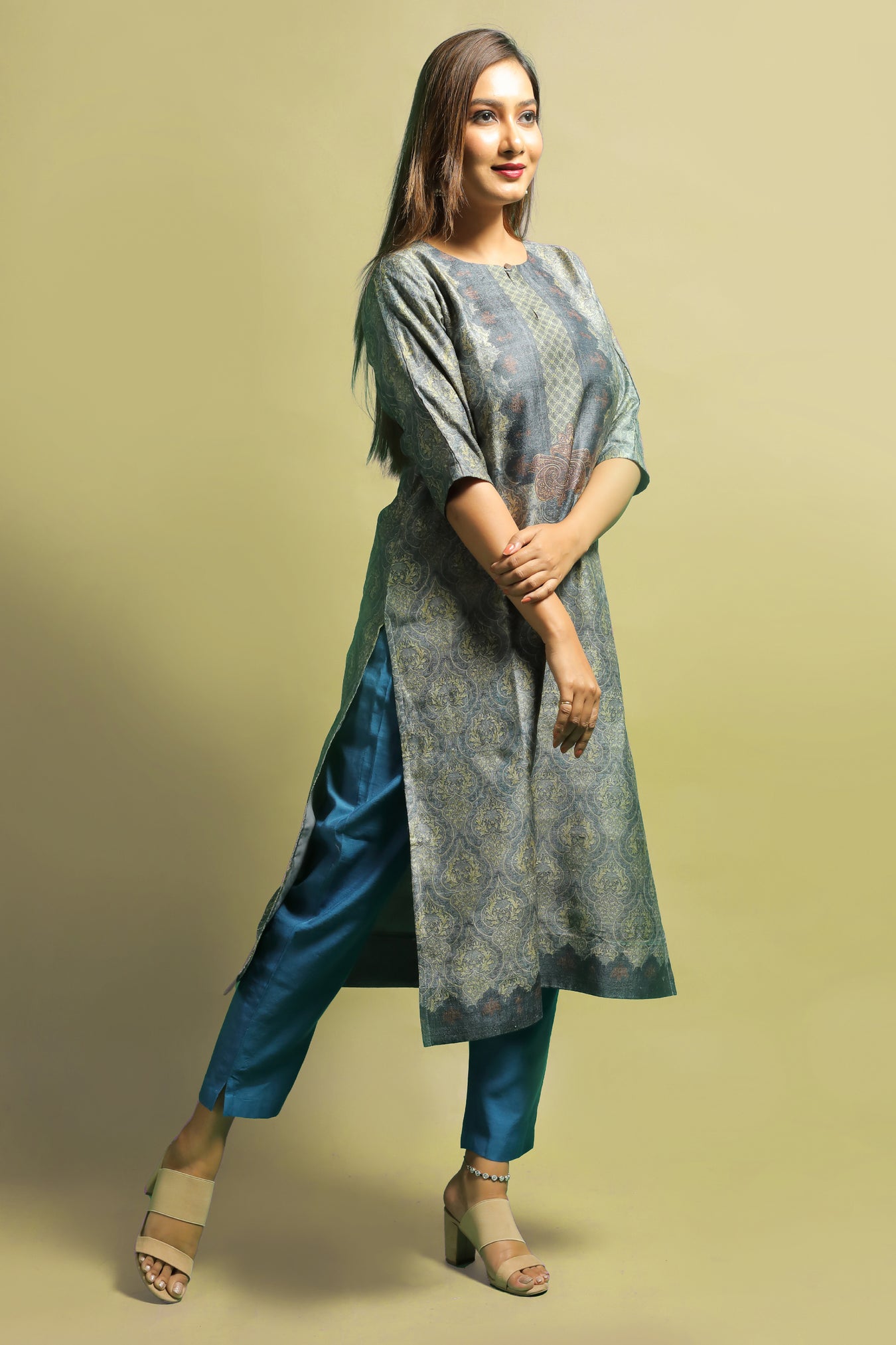 Tussar fabric was transformed into a sophisticated ethnic kurti. With its traditional Kilim motifs printed in subtle earthy tones, the piece makes a statement while also adding a touch of elegance and authenticity. This piece is distinguished by subtle colored motifs and a subtle shine. Detailed, intricate work adorns the neckline, distinguishing the entire look. Own and style this piece to highlight your inner beauty and elegance, as well as to flaunt the traditional look with confidence and pride.