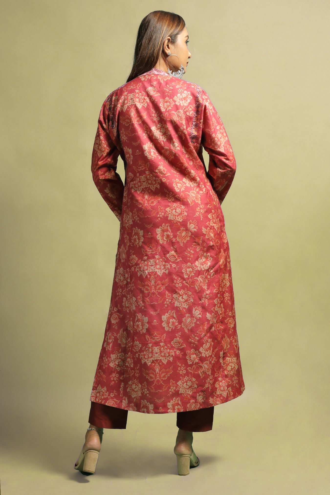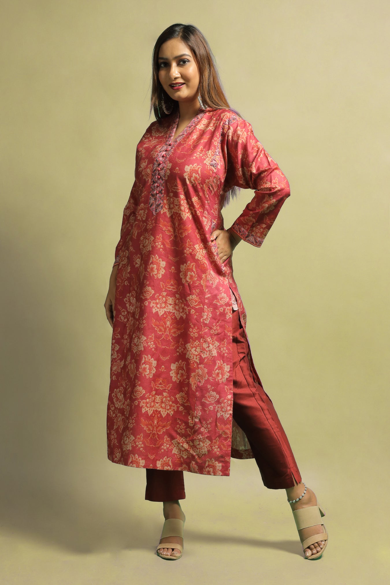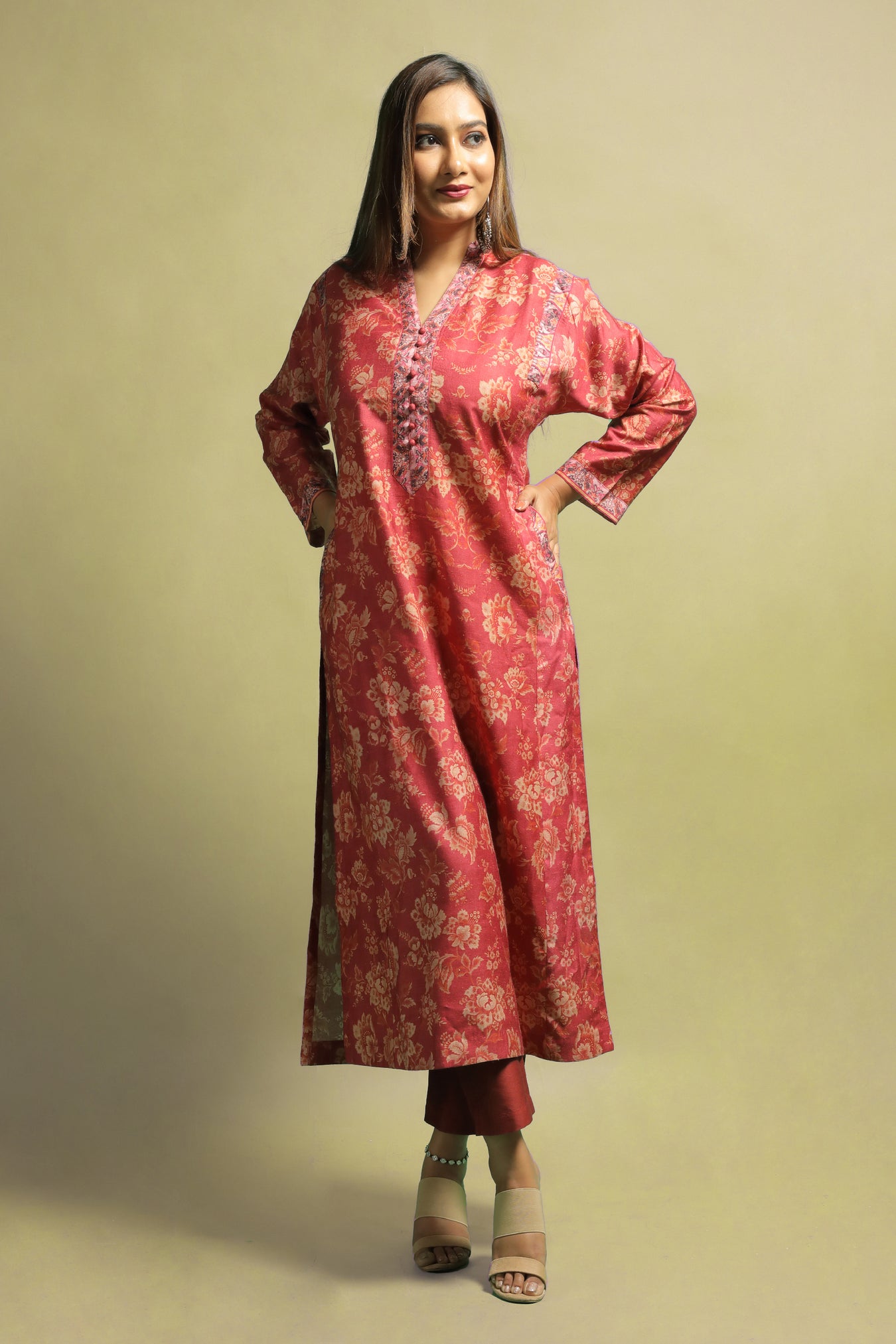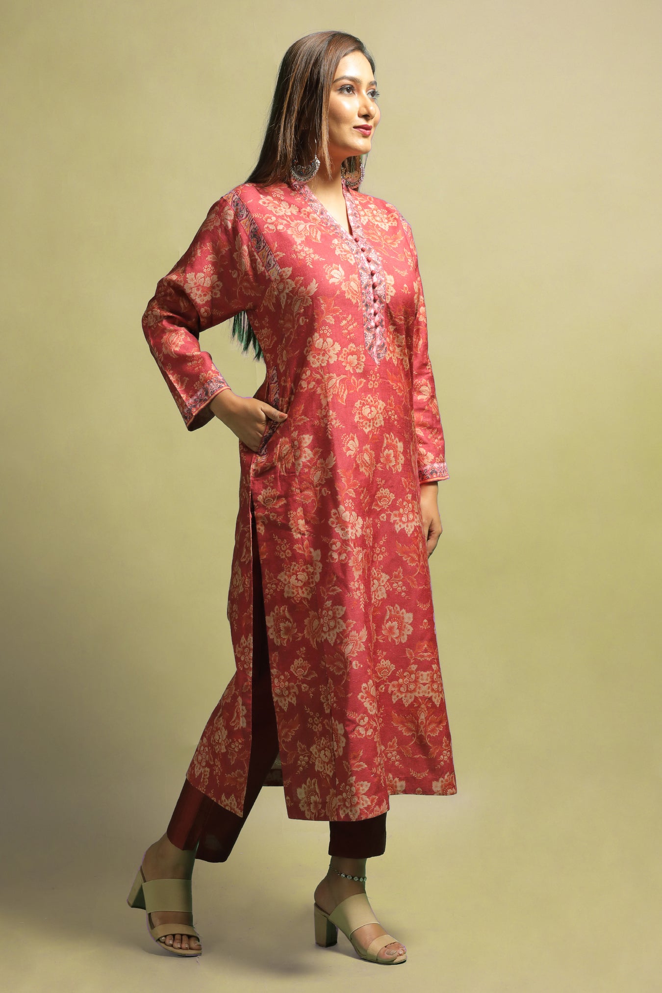 A classy ethnic kurti made from tussar fabric. The garment makes a statement while also bringing a sense of refinement and authenticity with its Oriental designs printed in earthy tones on a brilliant bold color. This piece is one-of-a-kind because of the bright toned designs with a sheen. The entire item is highlighted by a V-shaped neckline flanked by a contrasting colored stripe and buttons. Own and dress this piece to bring out your inner beauty and elegance, as well as to proudly wear the traditional appearance.