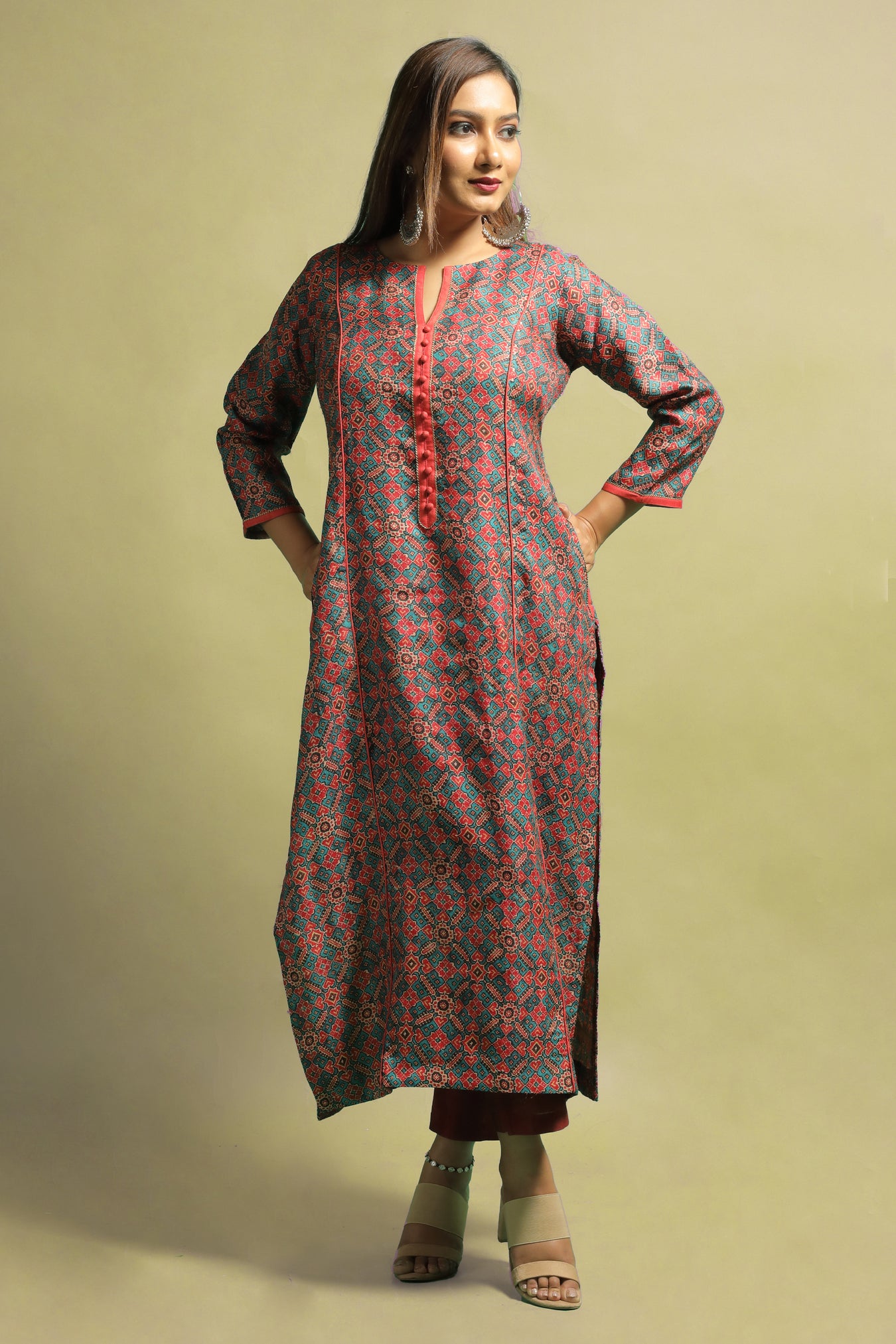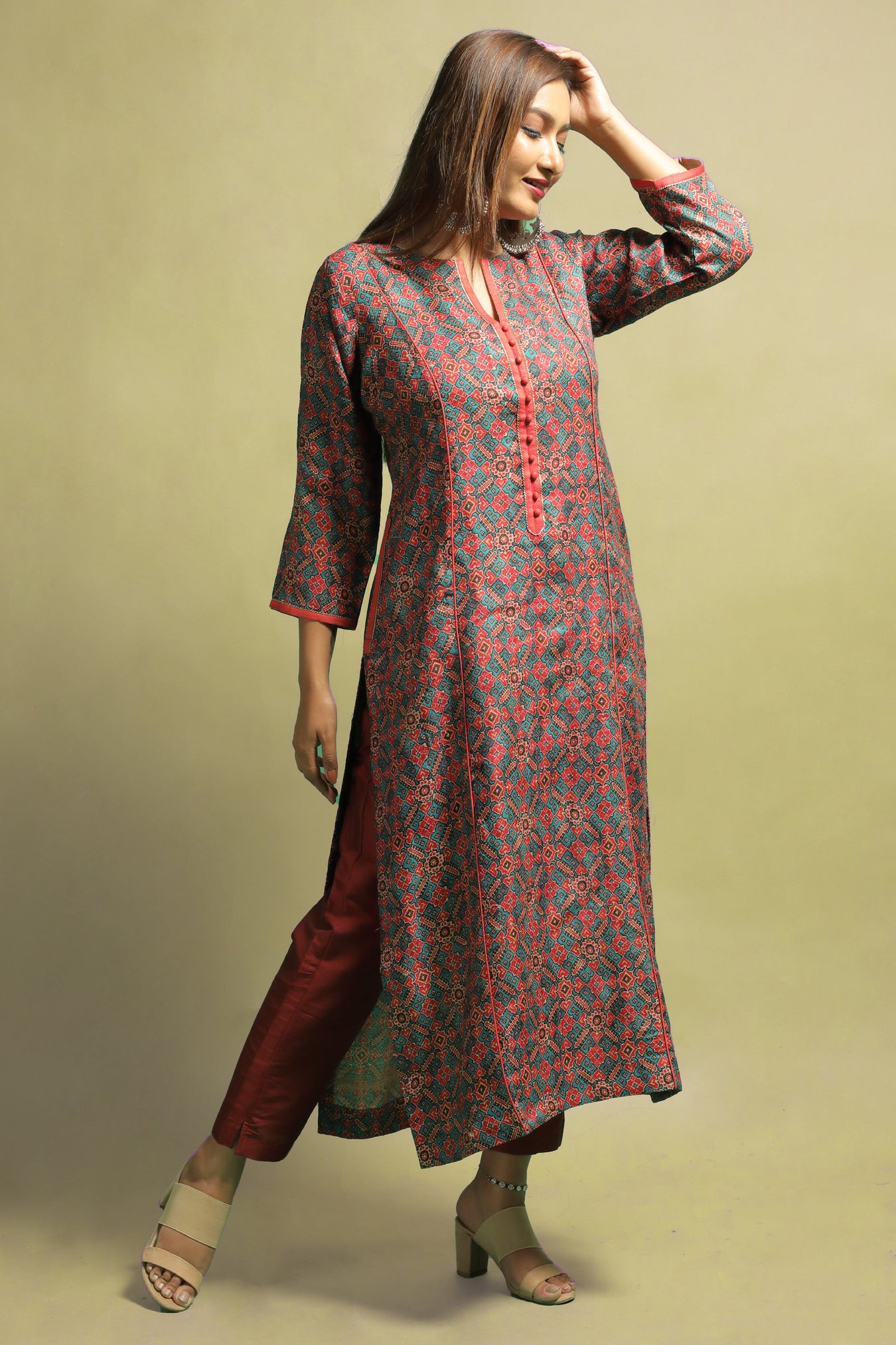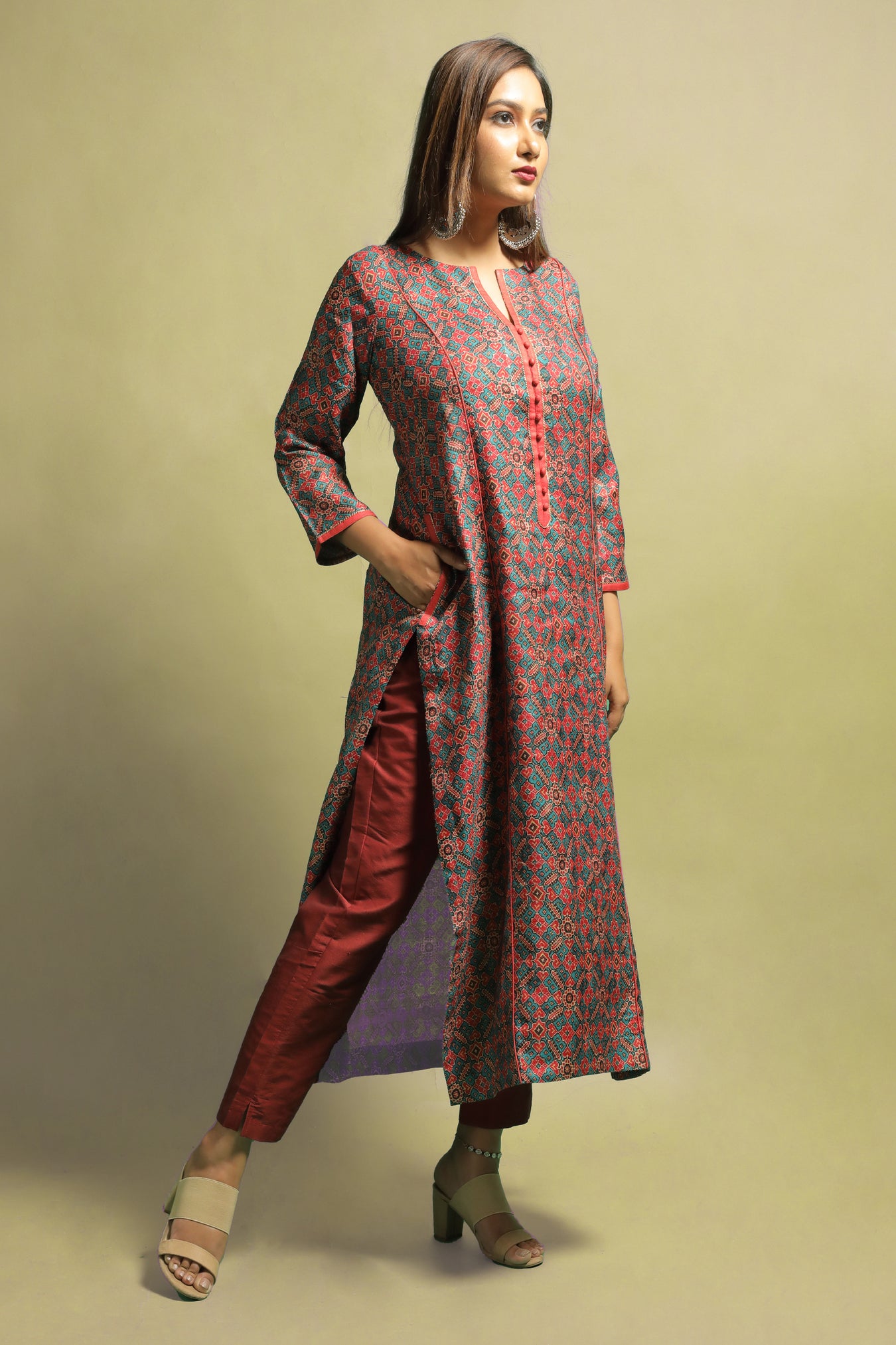 Tussar cloth has been converted into an elegant ethnic kurti. The garment makes a statement while also giving a sense of elegance and authenticity with its Patola designs printed in vivid tone on a vibrant strong shade. This piece is one-of-a-kind due to the bright toned designs with a sheen. The complete item is highlighted by a round neck-line with a v-shaped slit bordered by a contrasting colored stripe. Own and dress this piece to bring out your inner beauty and elegance, as well as to proudly display the traditional appearance.