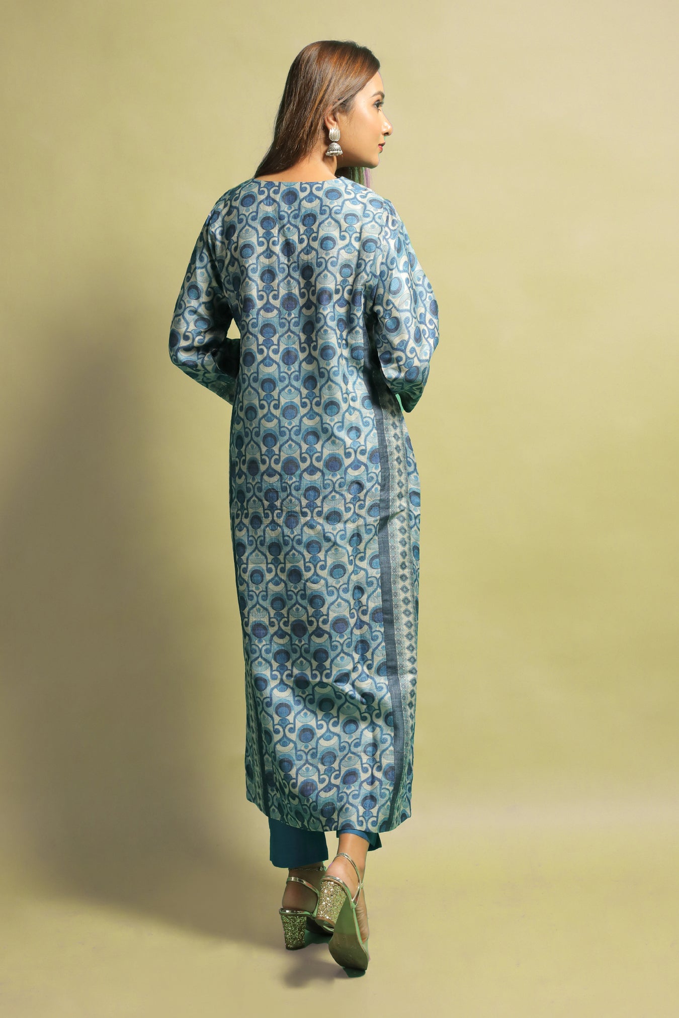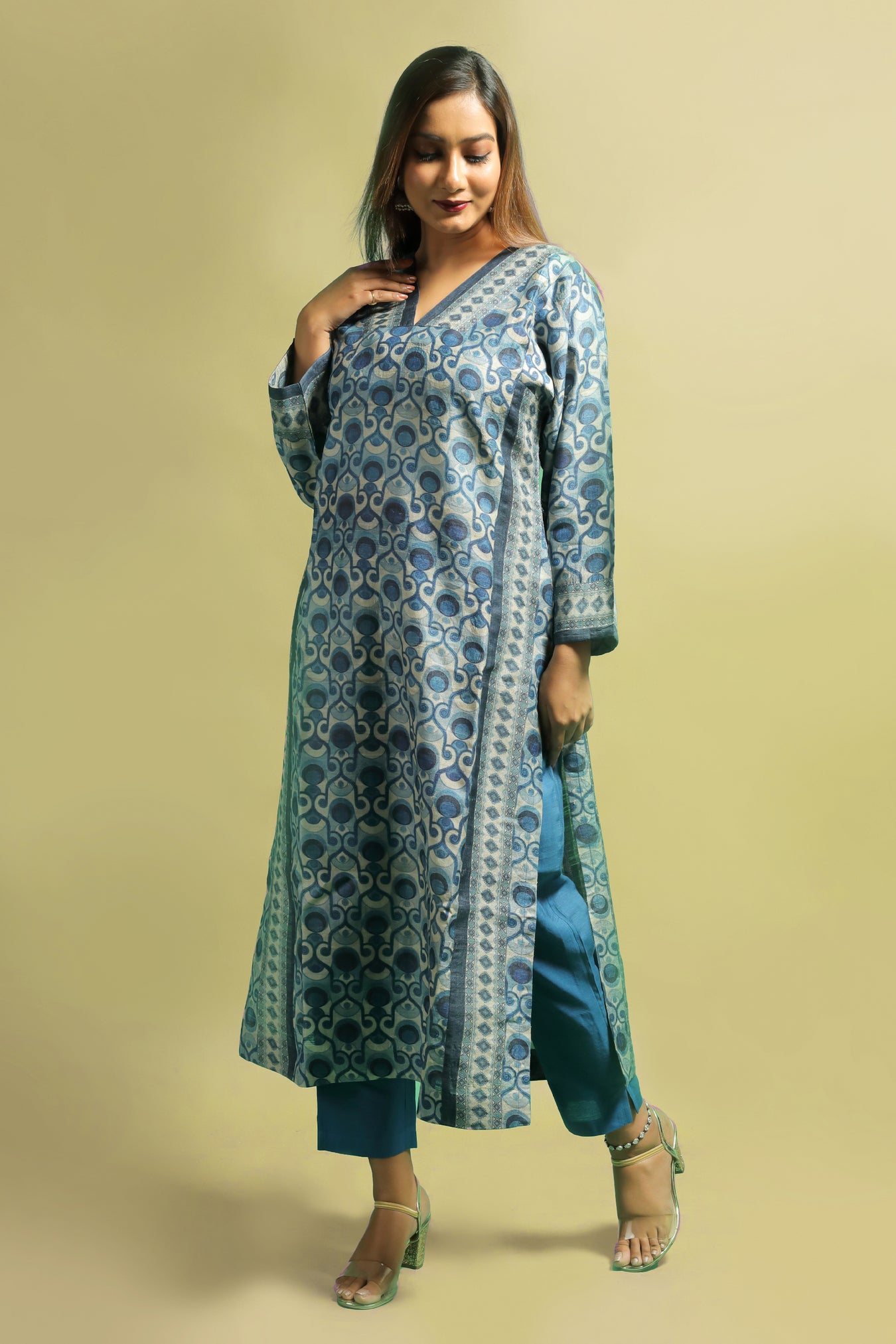 Tussar fabric was transformed into a sophisticated ethnic kurti. With its traditional Geometric motifs printed in blue and cream tones, the piece makes a statement while also adding a touch of elegance and authenticity. The subtle toned motifs with a shine make this piece one-of-a-kind. Detailed, intricate work adorns the neckline, distinguishing the entire look. Own and style this piece to highlight your inner beauty and elegance, as well as to flaunt the traditional look with confidence and pride.