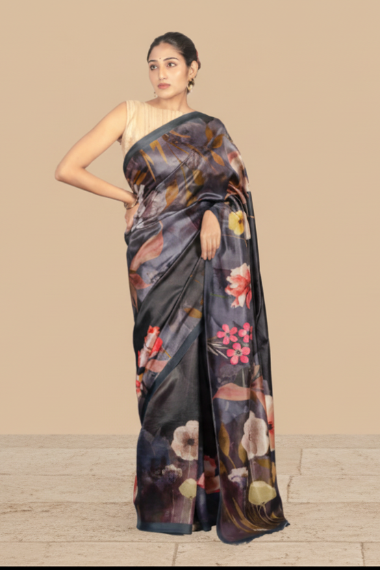 A captivating saree with bold floral prints on a rich midnight-hued base, exuding elegance and charm.