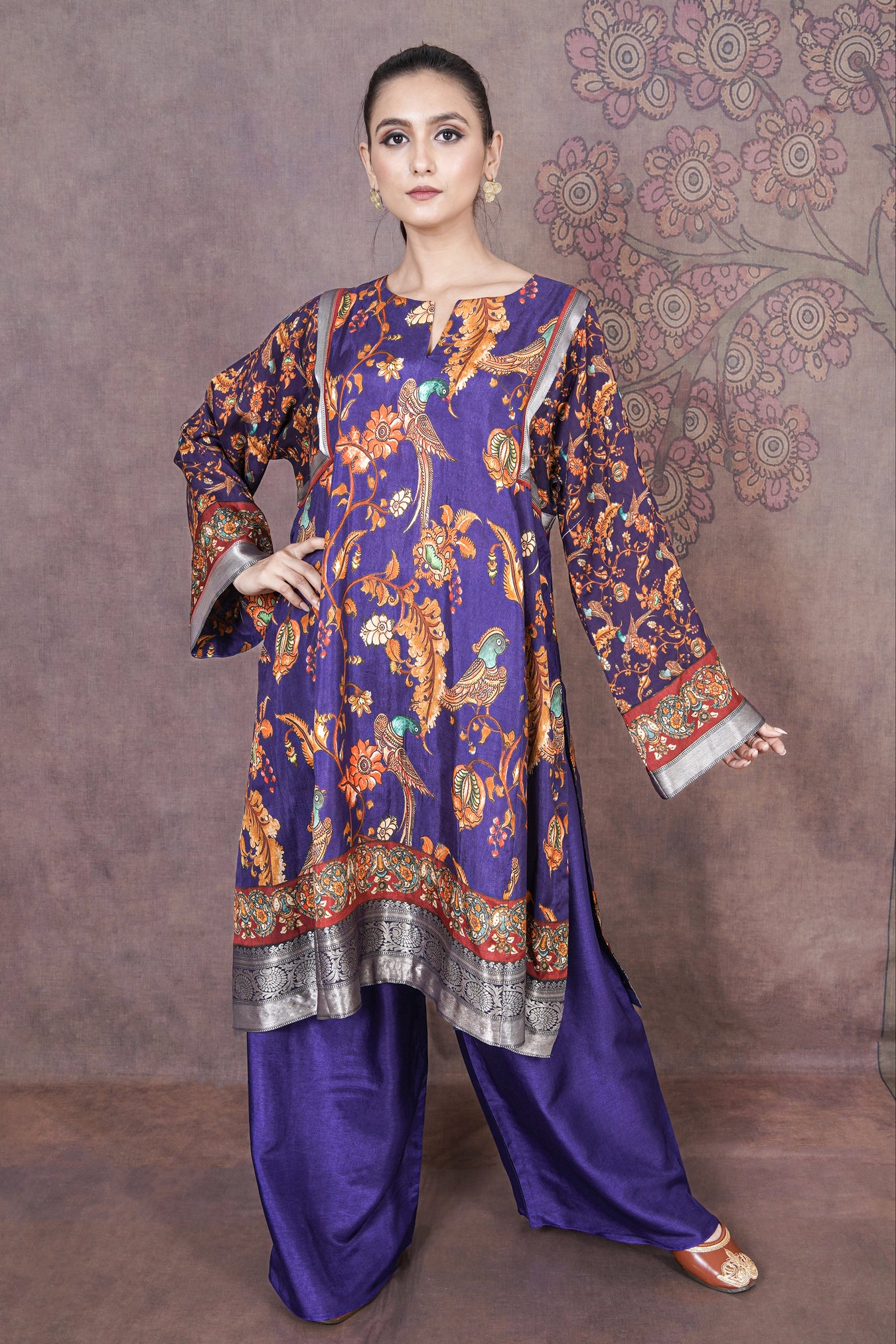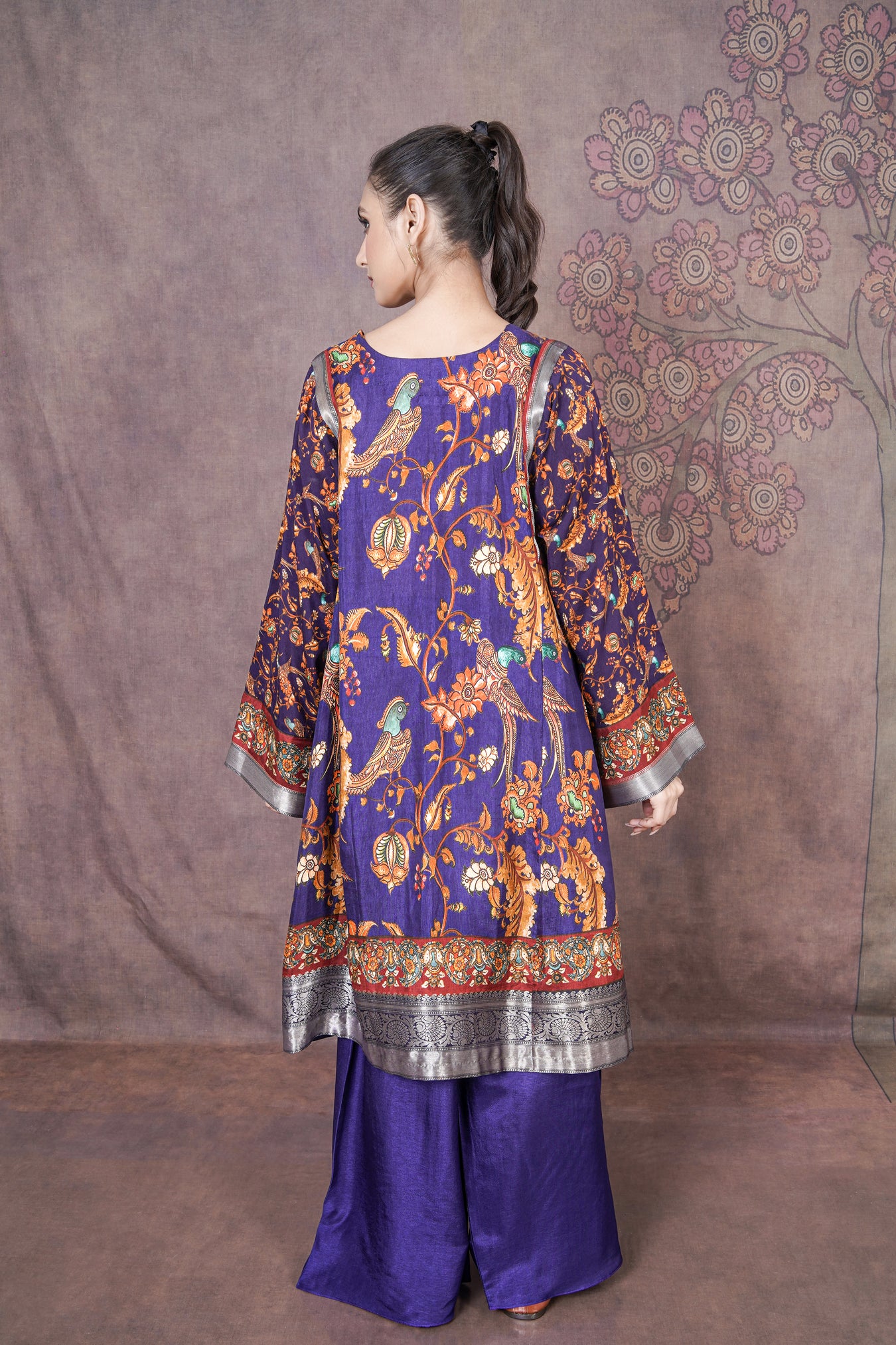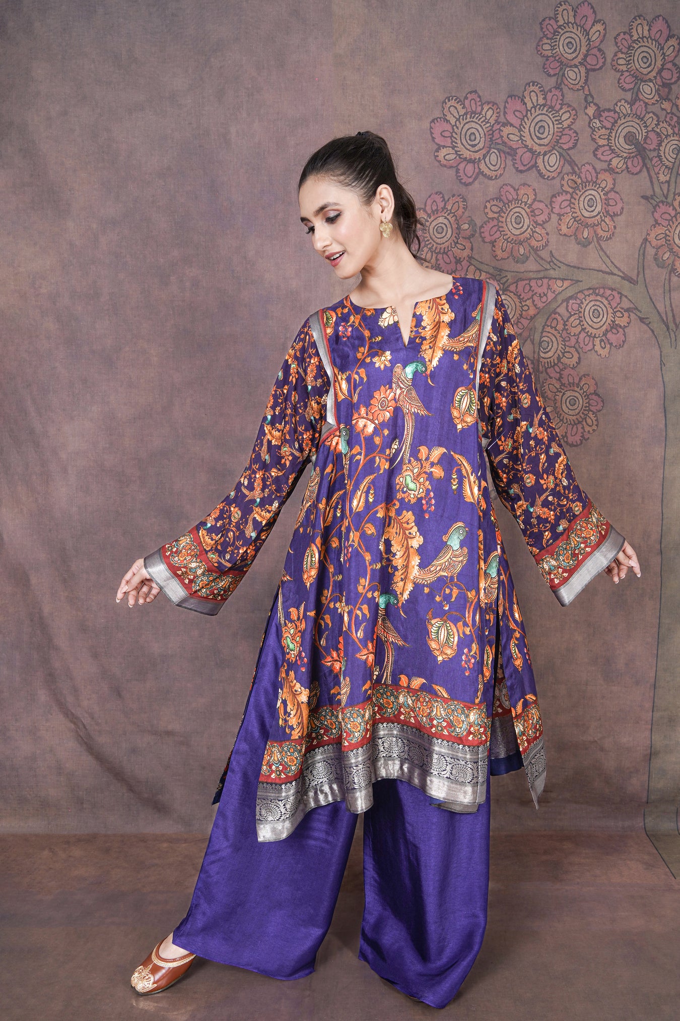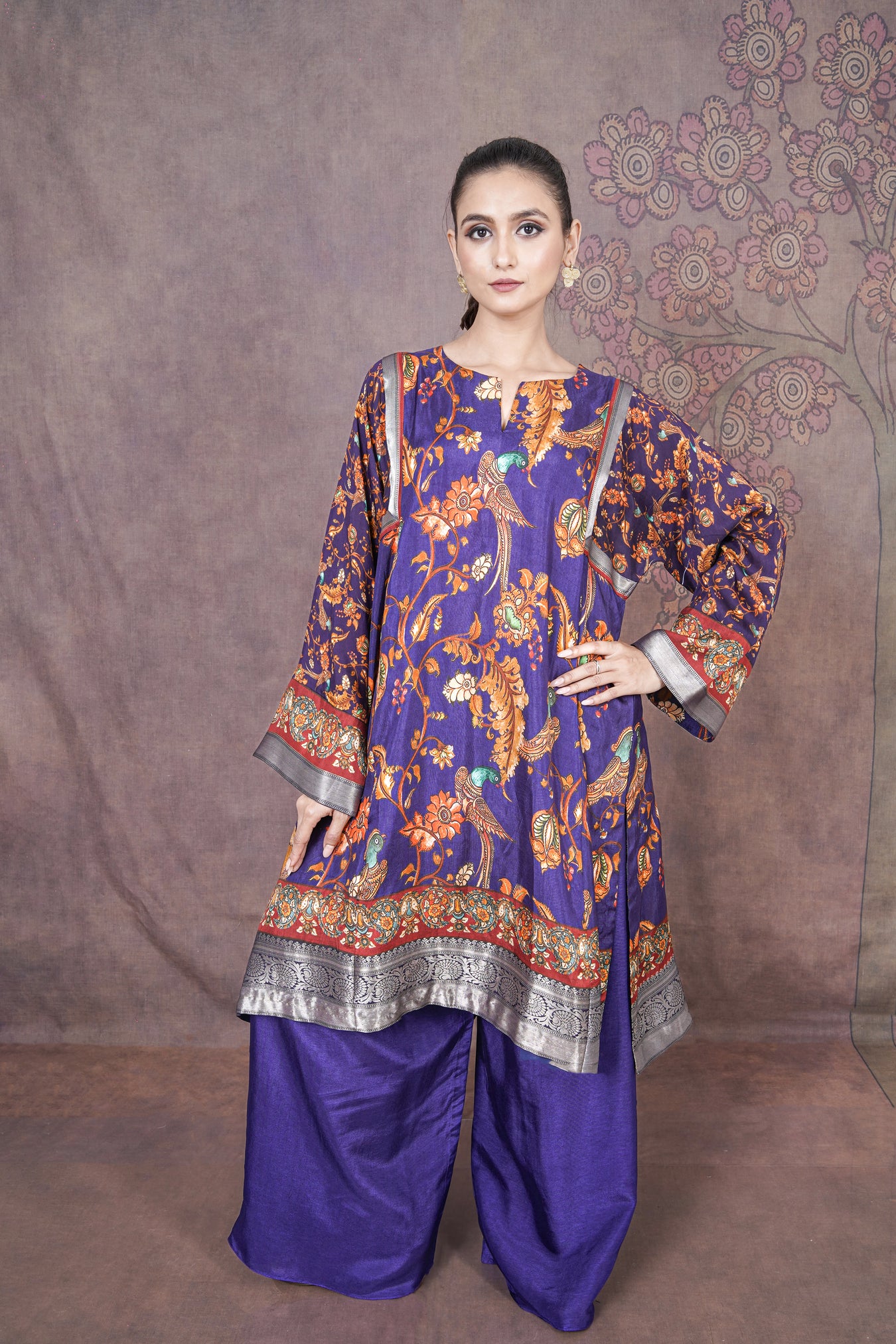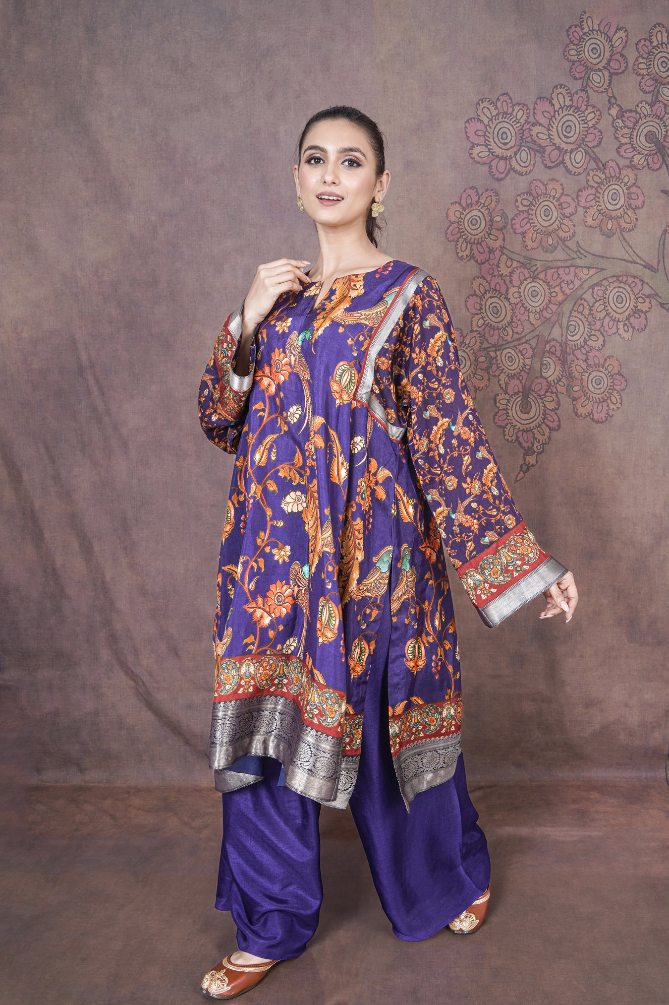 This beautiful purple kurti set in soft Russian silk features classic Kalamkari prints, giving it a rich yet effortless ethnic charm.