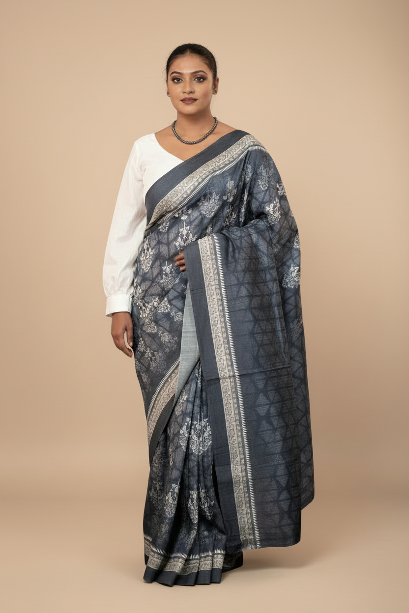 Colour: BLUEFabric: TUSSAR Pattern and print: Discharge print motif over clip Tie n Dye base. The shades of Greys, Blue and White, makes it a got to attire at any formal occasions. Bold yet soft vibes of the attire make it a 'must have' piece in the wardrobe. The cool, bold beauty gives you a statement look.