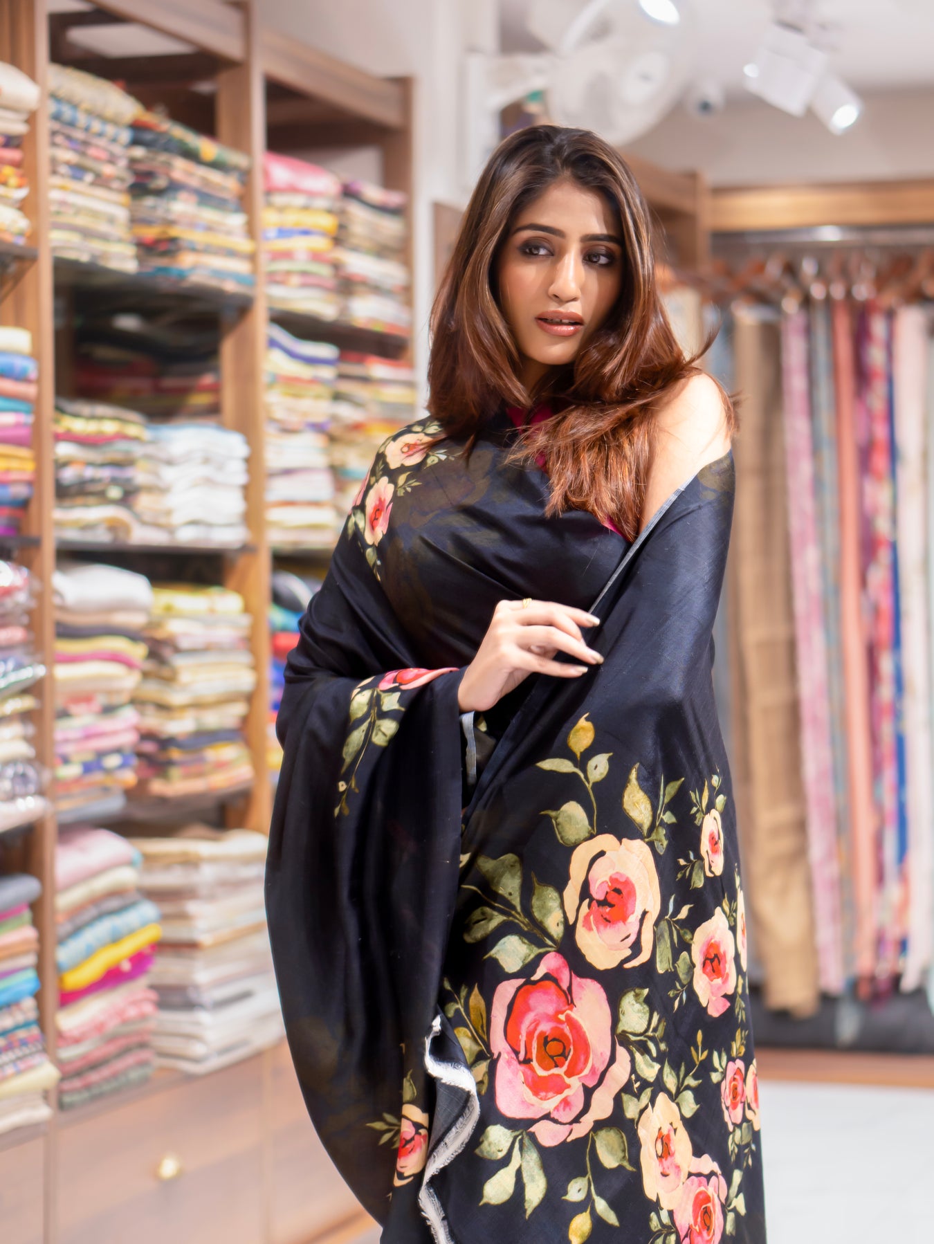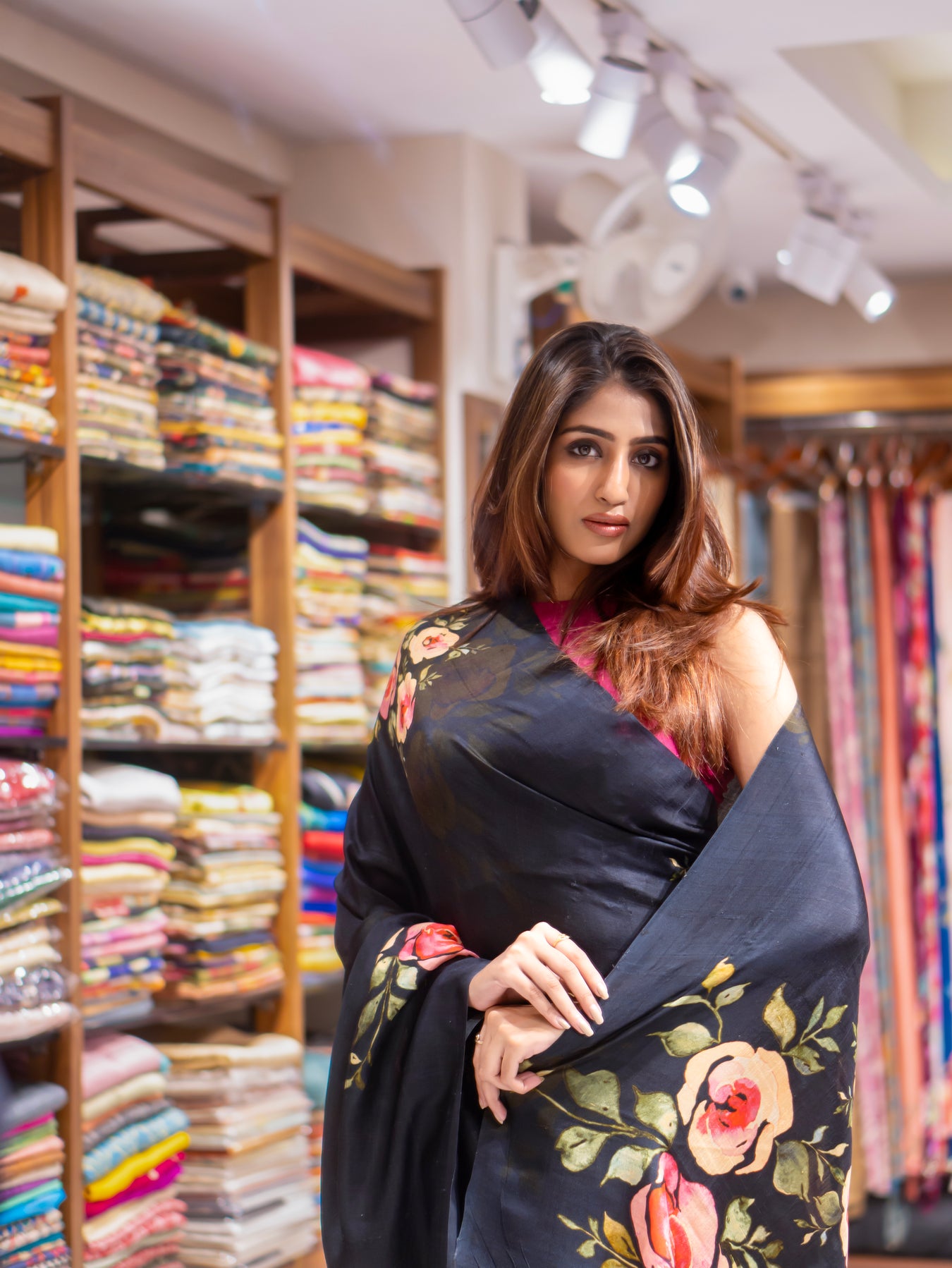 Black Mulberry silk with digital floral printed roses. Comfortable with smooth and luxurious hand feel.