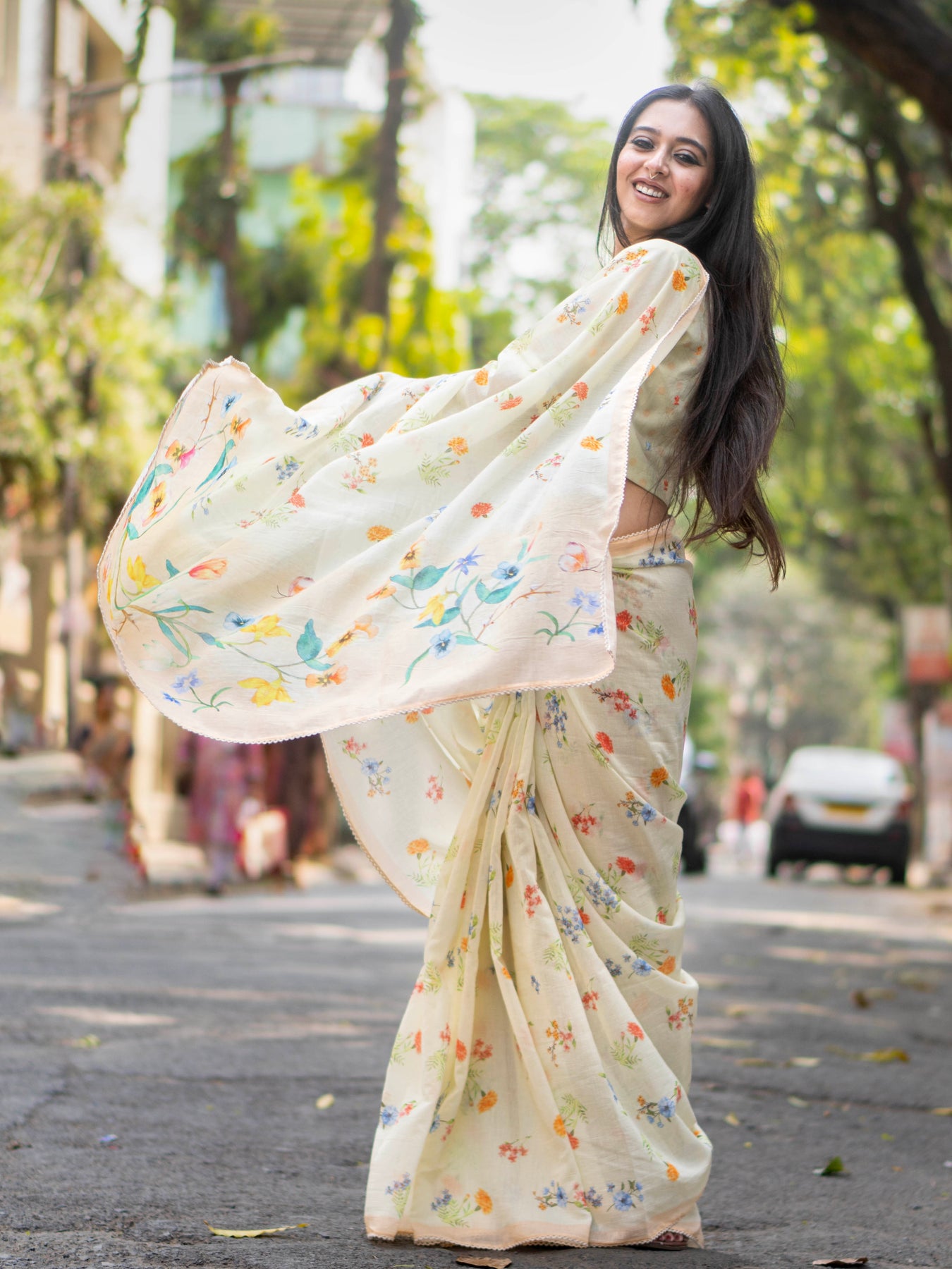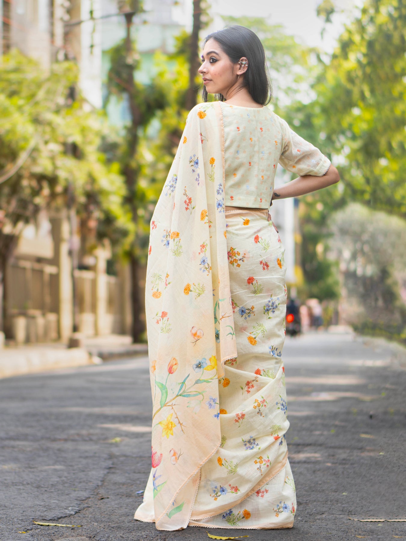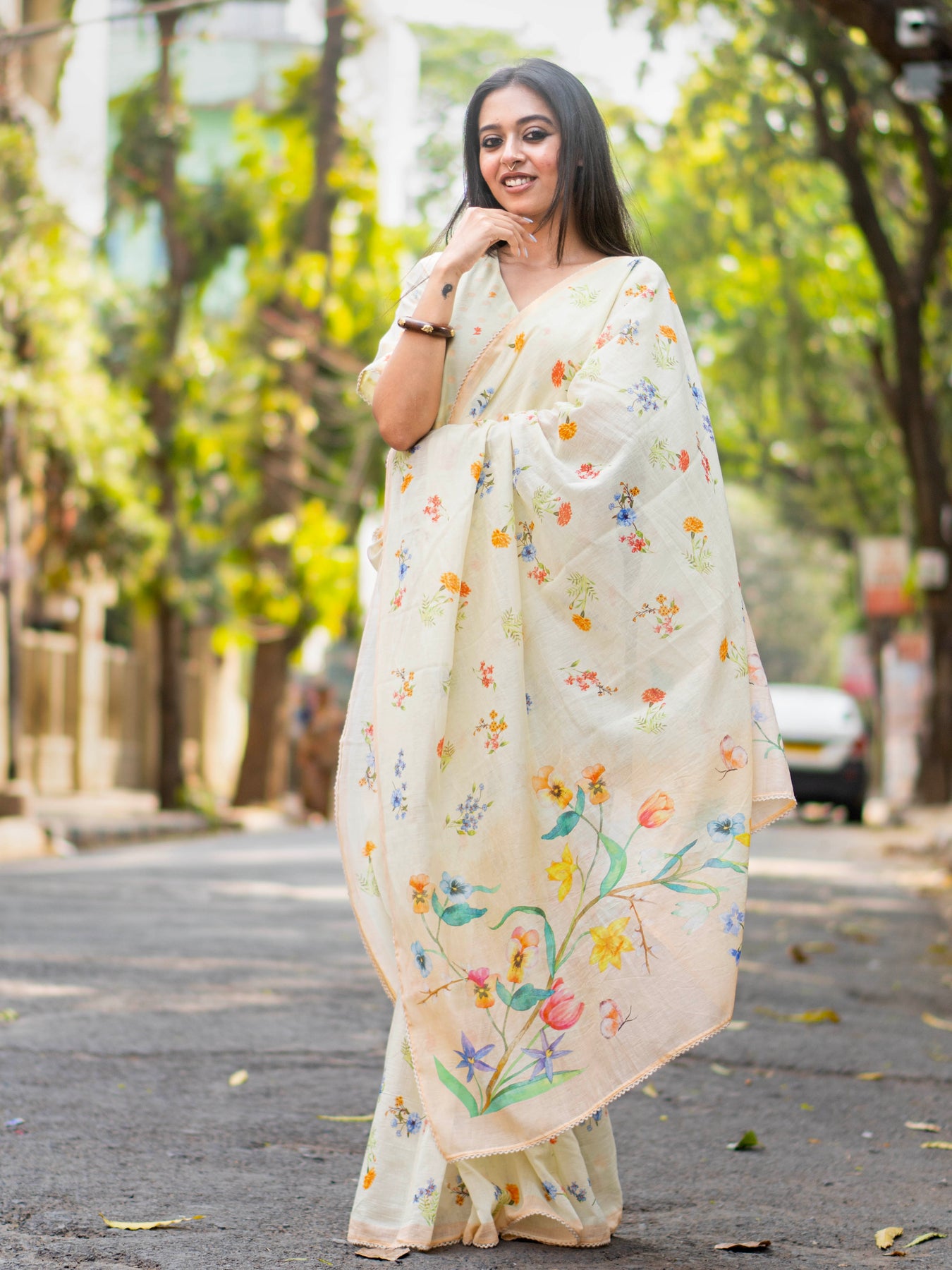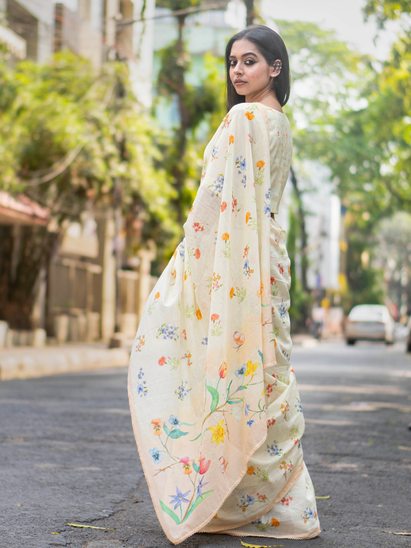 Indiloom presents a cream Mul Chanderi saree with digital floral print, offering a lightweight texture and elegant traditional appeal.