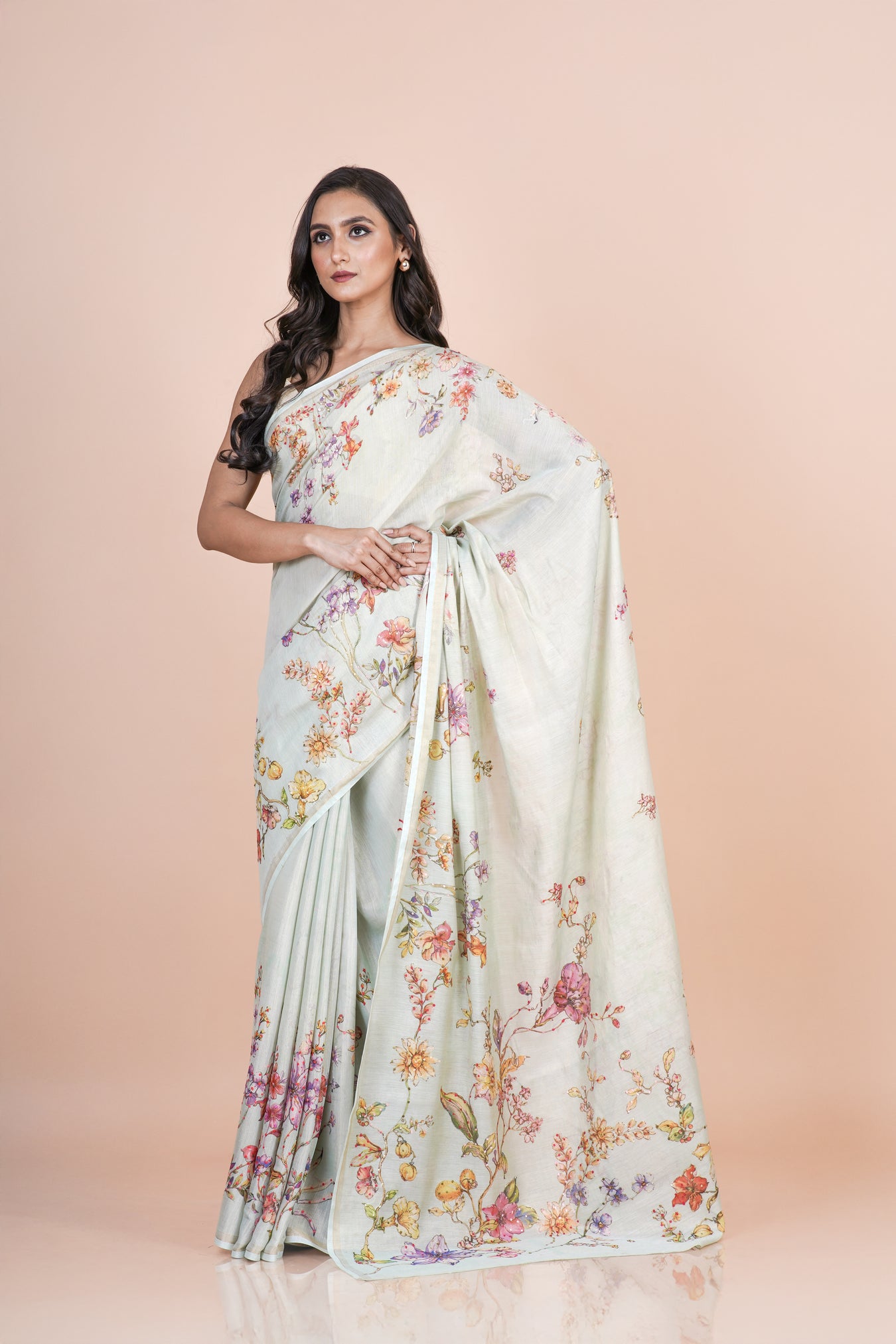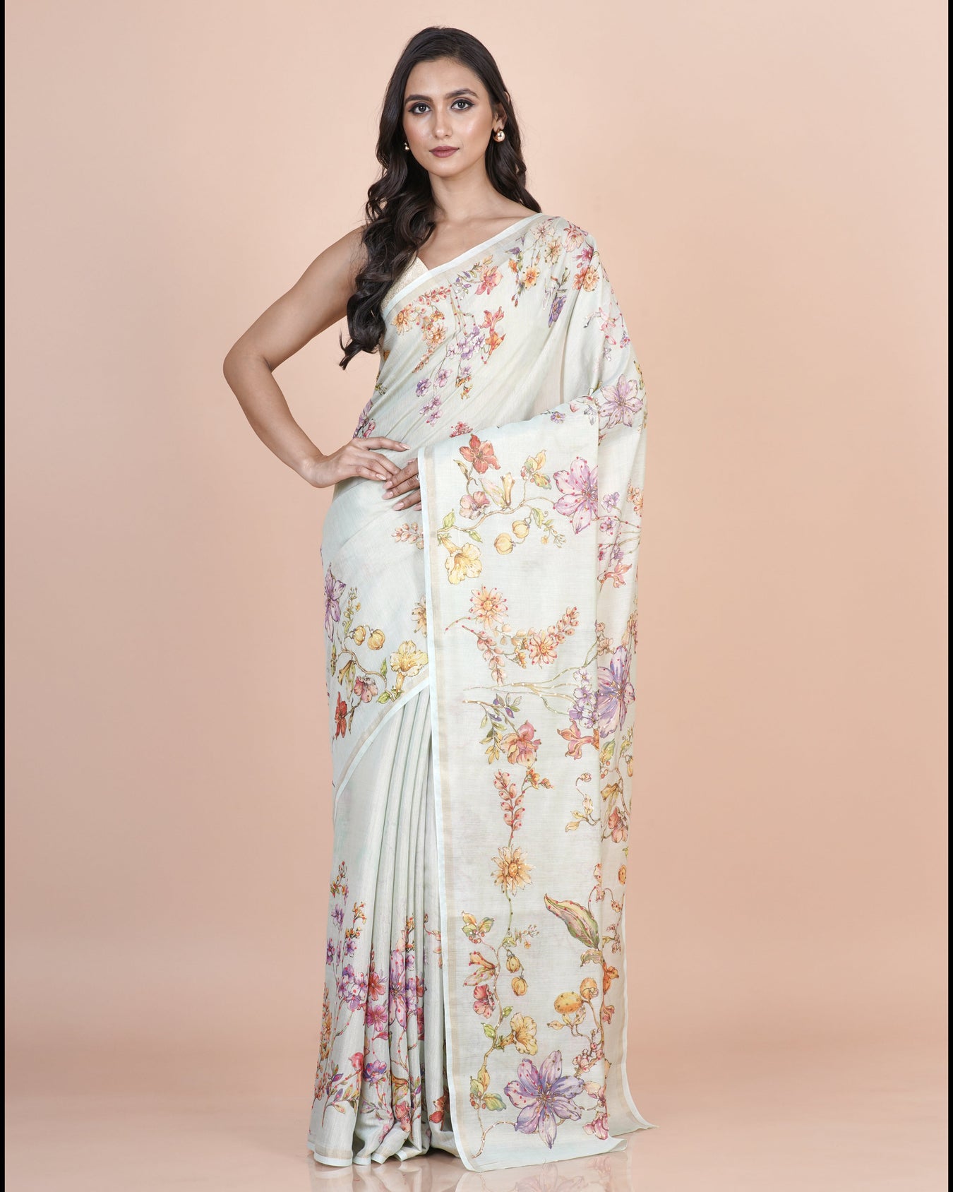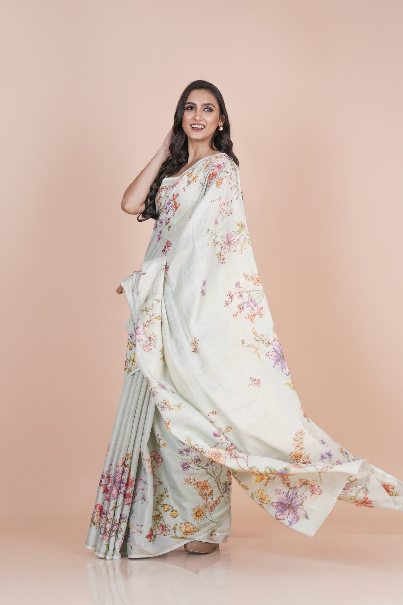 Premium sea green cotton tissue saree by Indiloom with digital floral print and French knots, perfect for refined ethnic wear.