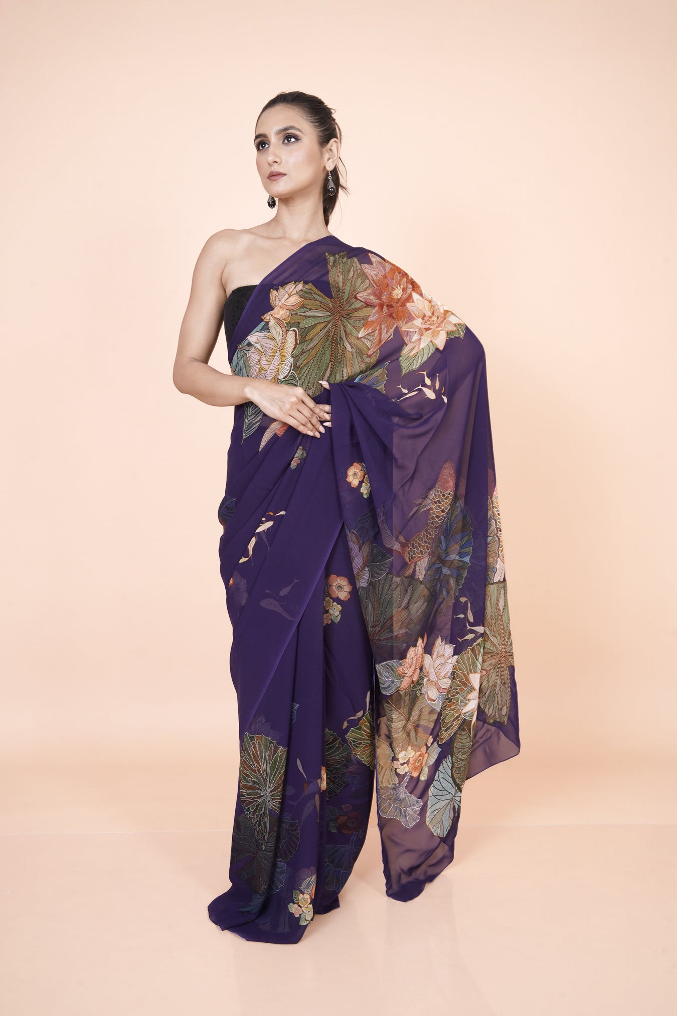 Purple georgette saree adorned with digital botanical floral prints, featuring a lightweight, flowy drape and refined elegance ideal for festive and daytime wear.