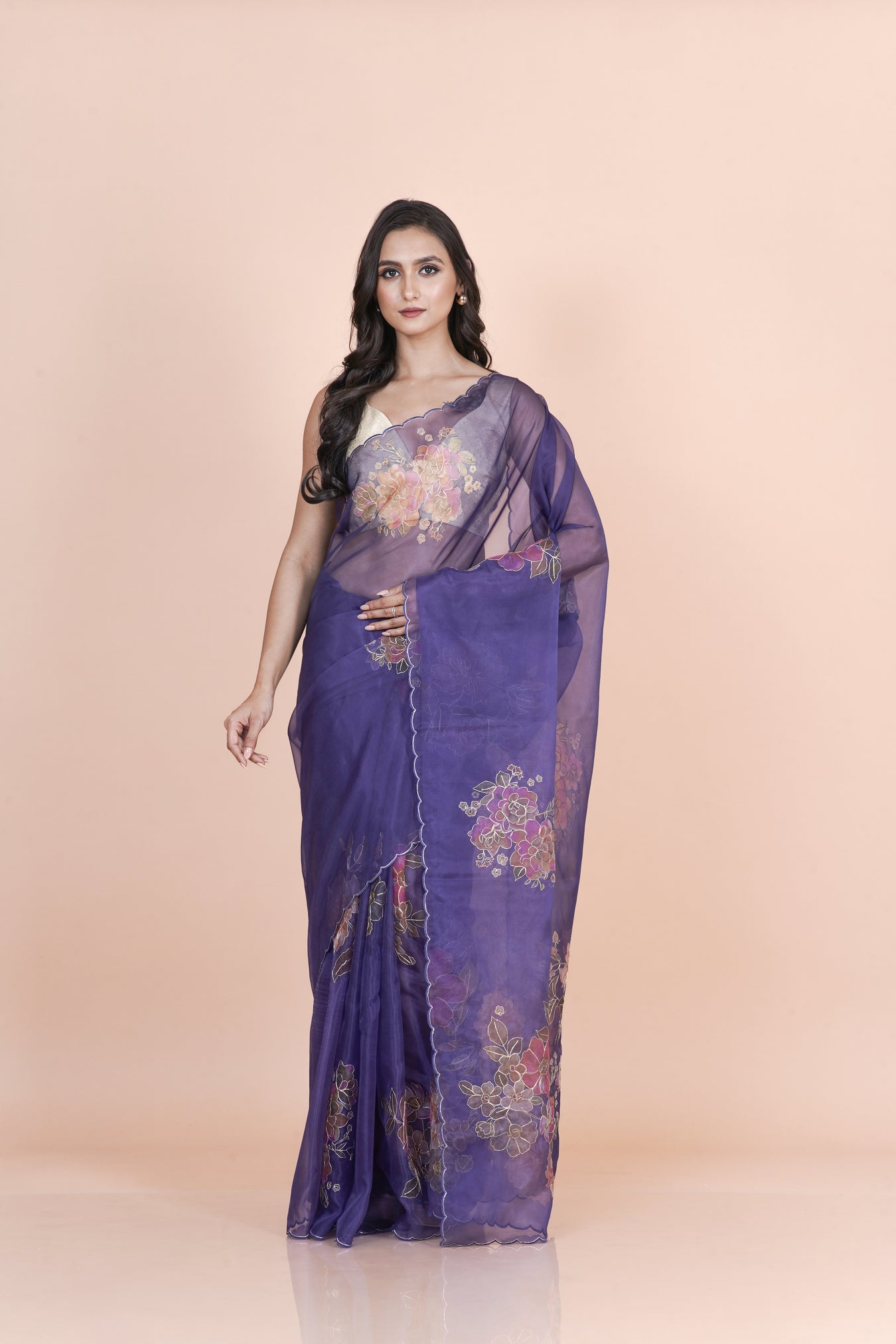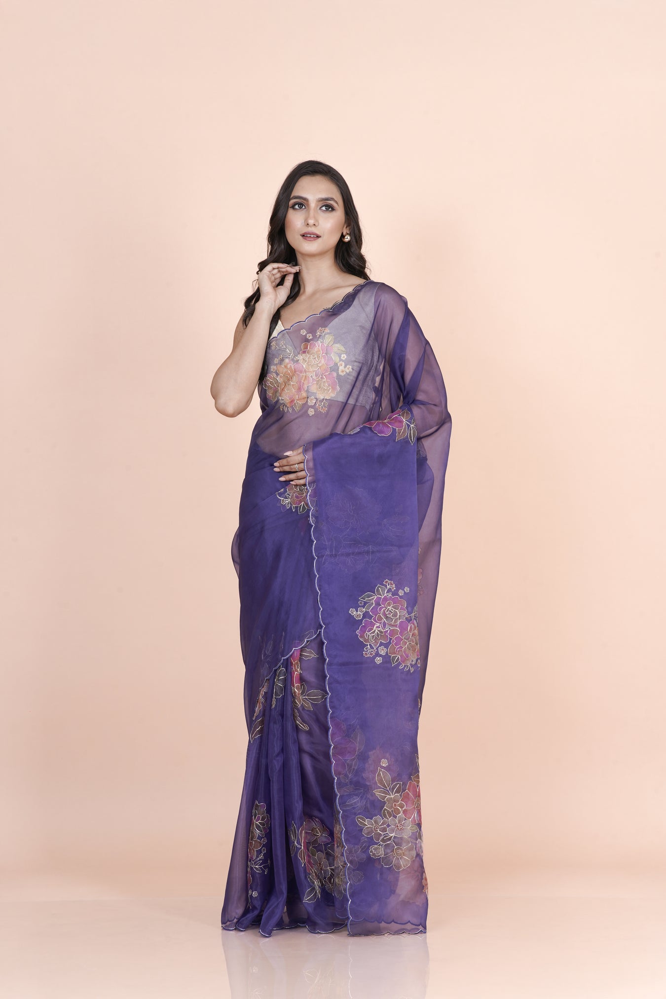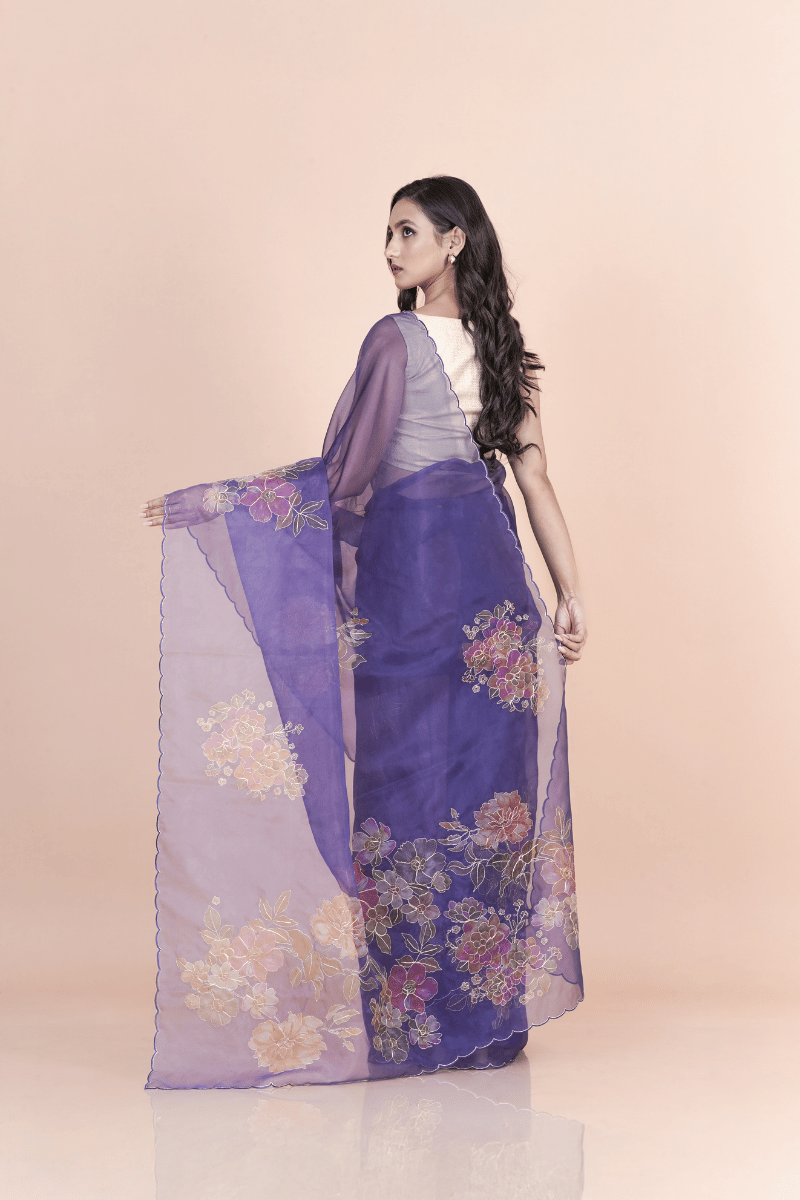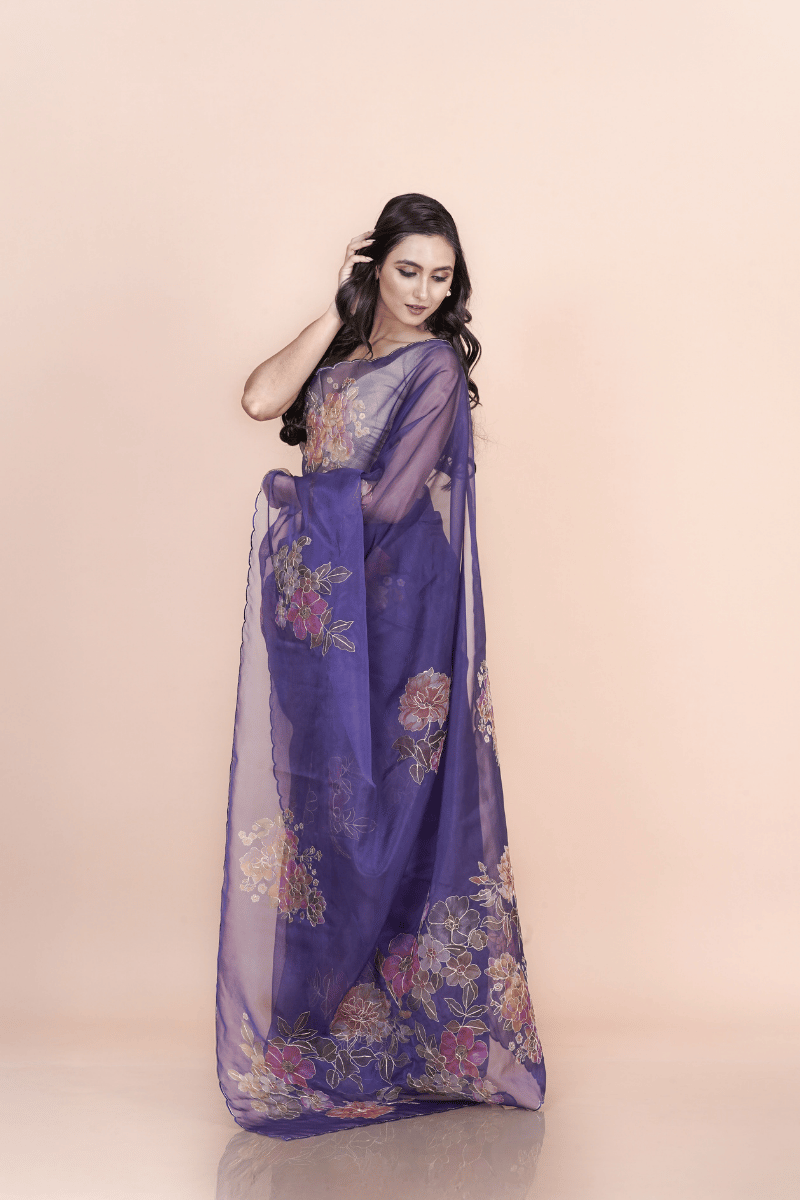 Purple nylon organza saree adorned with printed floral motifs and fine hand pita work, featuring a sheer texture and graceful fall for elegant festive styling.