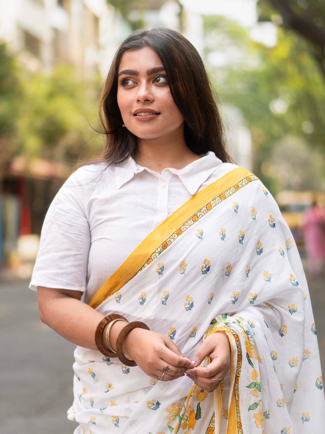 Premium White and Yellow Mulmul saree by Indiloom, detailed with digital floral print for refined everyday and occasion wear.