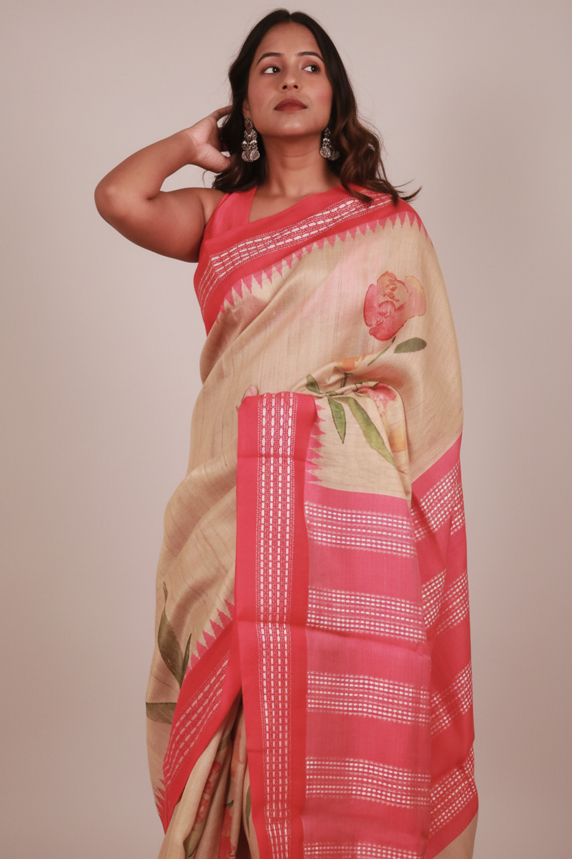 Experience the captivating Soft Tussar Tale saree. Pure Tussar silk, delicate pink border, and soft digital floral print create an elegant charm. Draped in luxury, this exquisite piece blends comfort and style for any occasion.