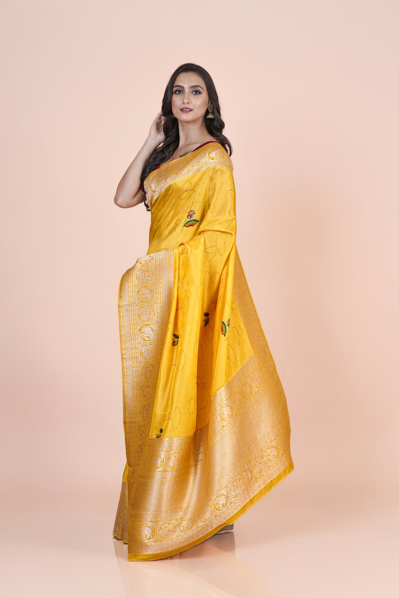 A vibrant yellow MT Khaddi Silk saree by Indiloom, featuring digital printed floral patterns and a timeless handcrafted feel.