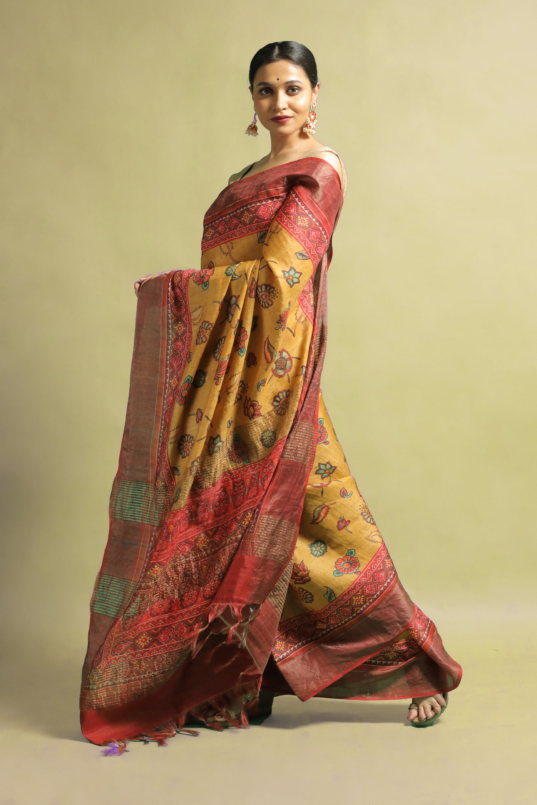 Pattern and print: Tussar silk saree drapes gracefully over feminine curves, falling smoothly and softly. The tussar fabric lends the saree a soft vintage look. The entire saree is embellished with stylized Kalamkari digital prints, which are complemented by a Patola printed border, evoking a lifetime of artistry and heritage beauty. The earthy tones, stylized kalamkari designs, and contrasting patola border set this saree apart. Drape this one-of-a-kind garment around your curves and flaunt it proudly to accentuate the strong, regal beauty, and elegance of feminine beauty.