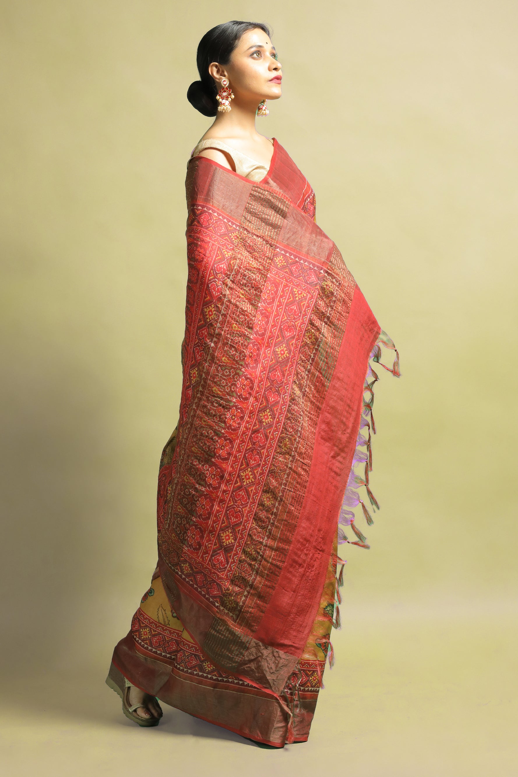 This saree showcases a stunning combination of Kalamkari floral prints and a Patola border, blending traditional artistry with contemporary design. The intricate floral motifs beautifully complement the rich color palette, creating a visual feast for the eyes.