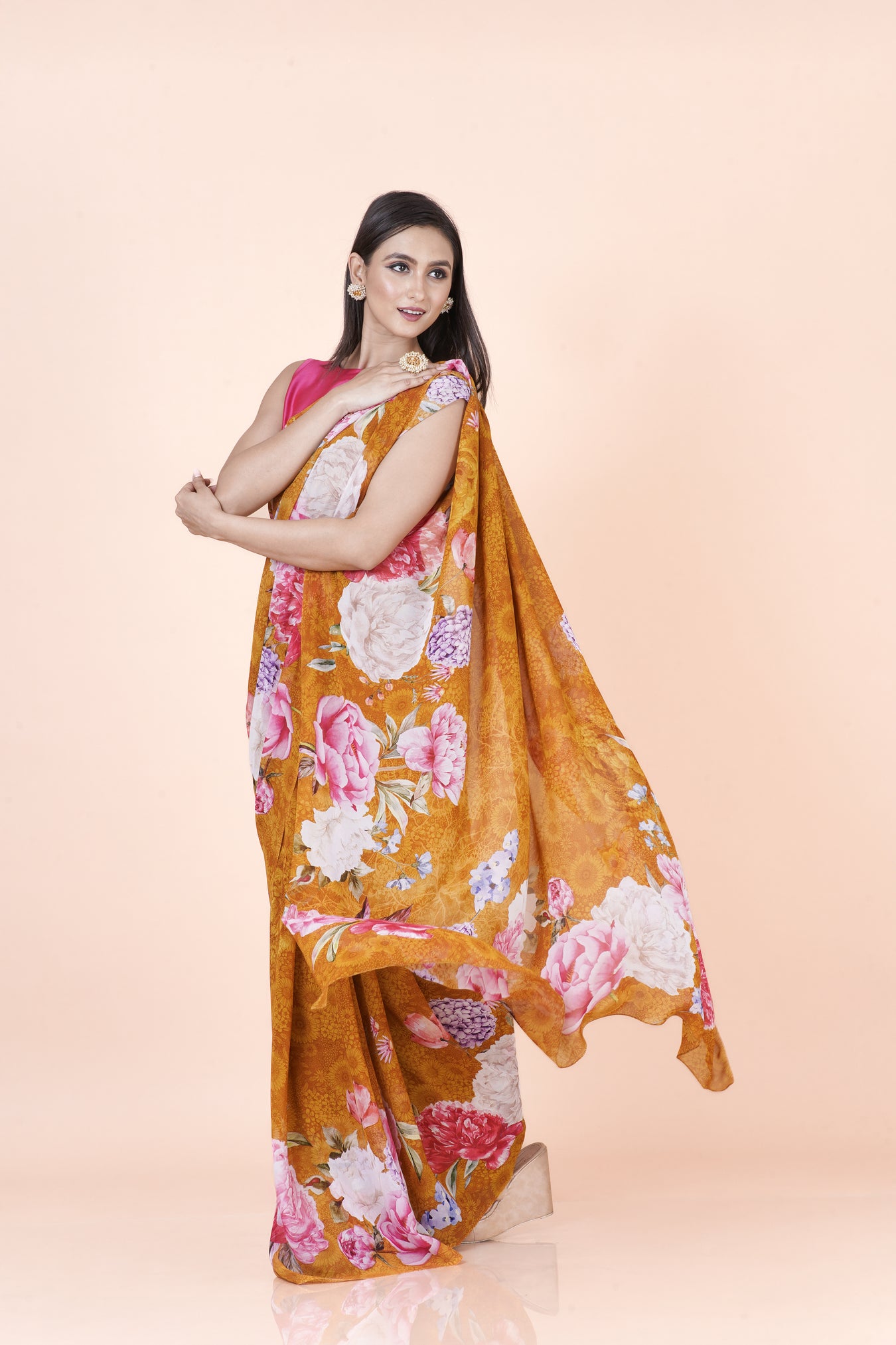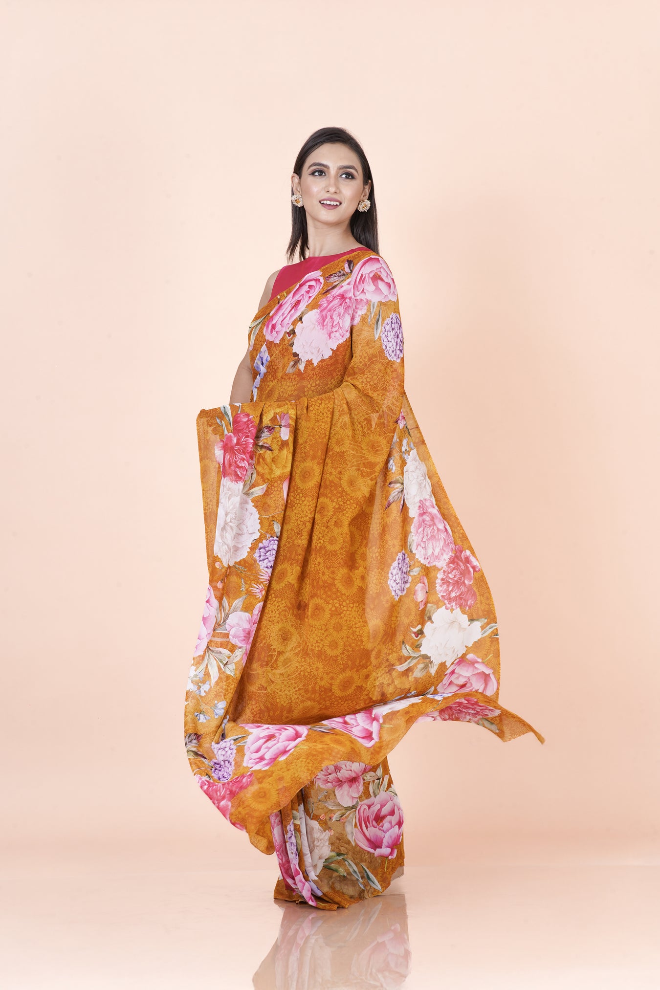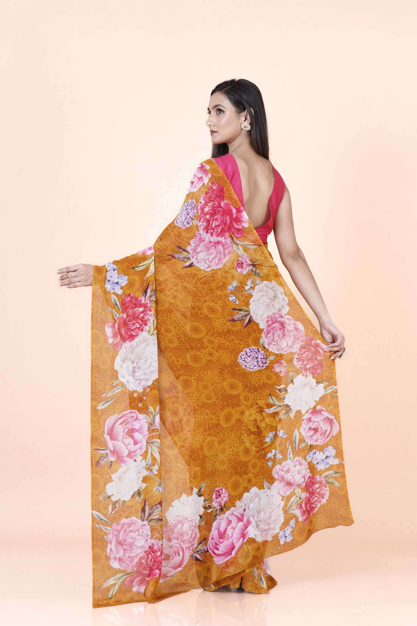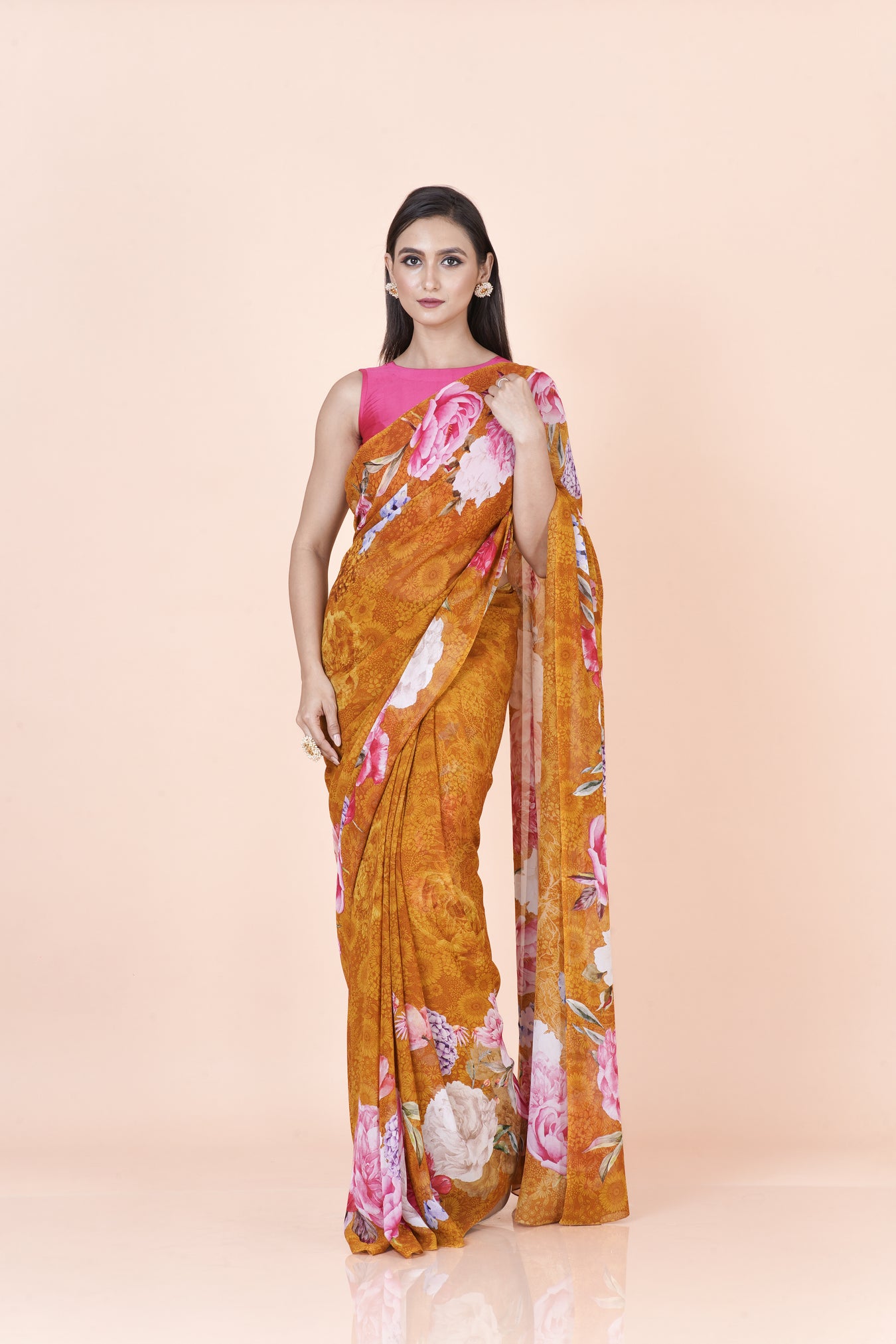 Golden georgette saree adorned with digital floral prints, featuring a soft, fluid drape and graceful sheen, perfect for elegant occasions and refined festive styling.