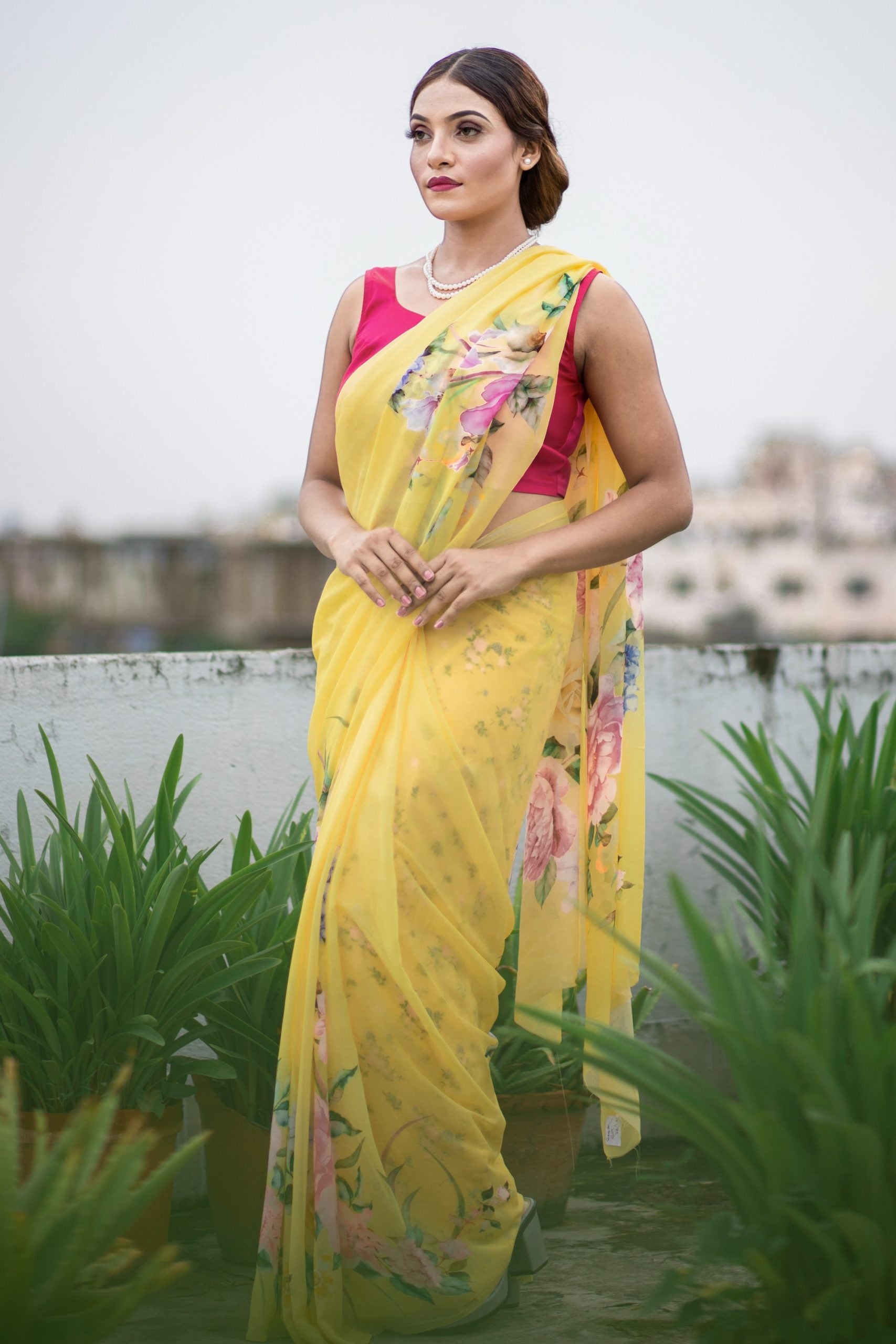 Pattern and print: Floral prints over lemony yellow Georgette saree. The soft color of the fabric, makes a standout. The Colorful prints make a contrast over the yellow solid base fabric. The saree emits a soft, feminine vibe bringing out the subtle beauty of the saree.